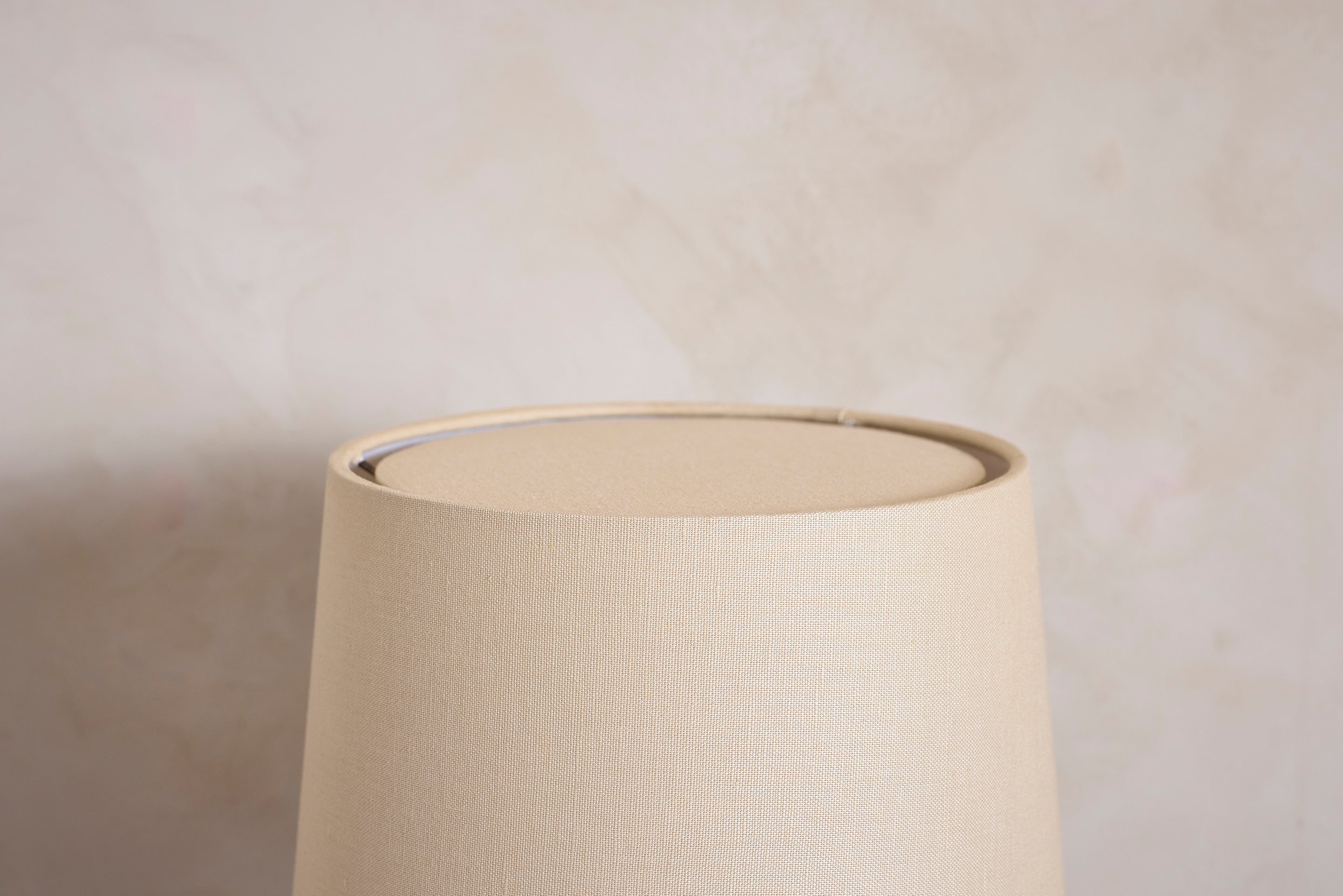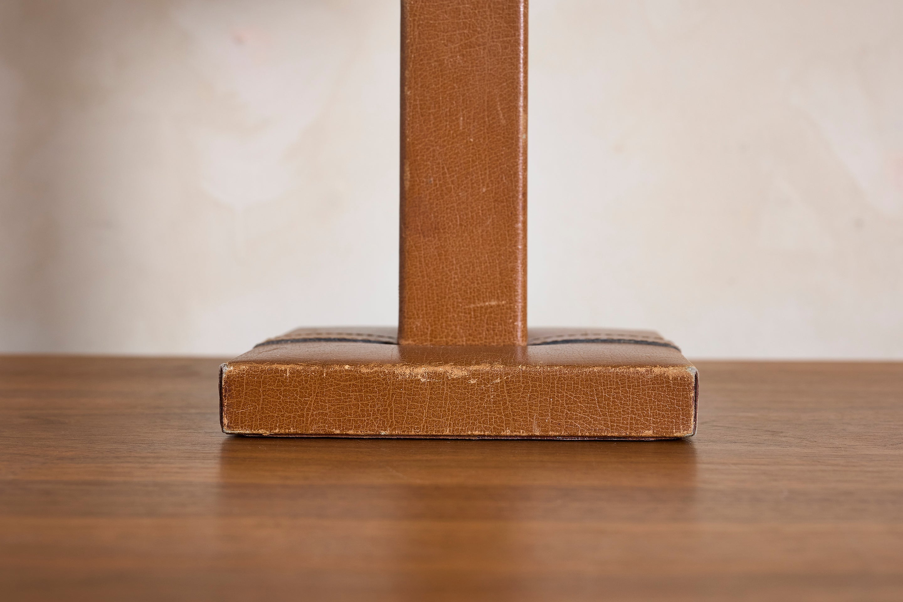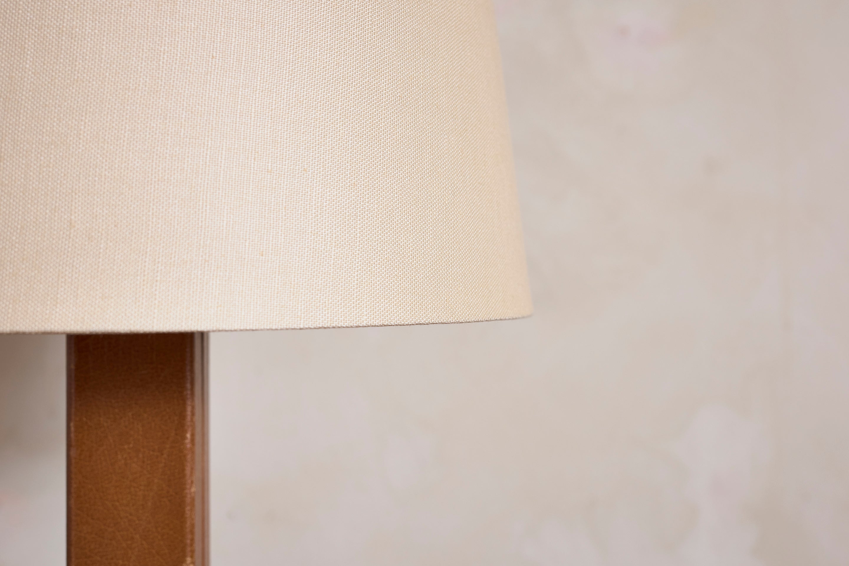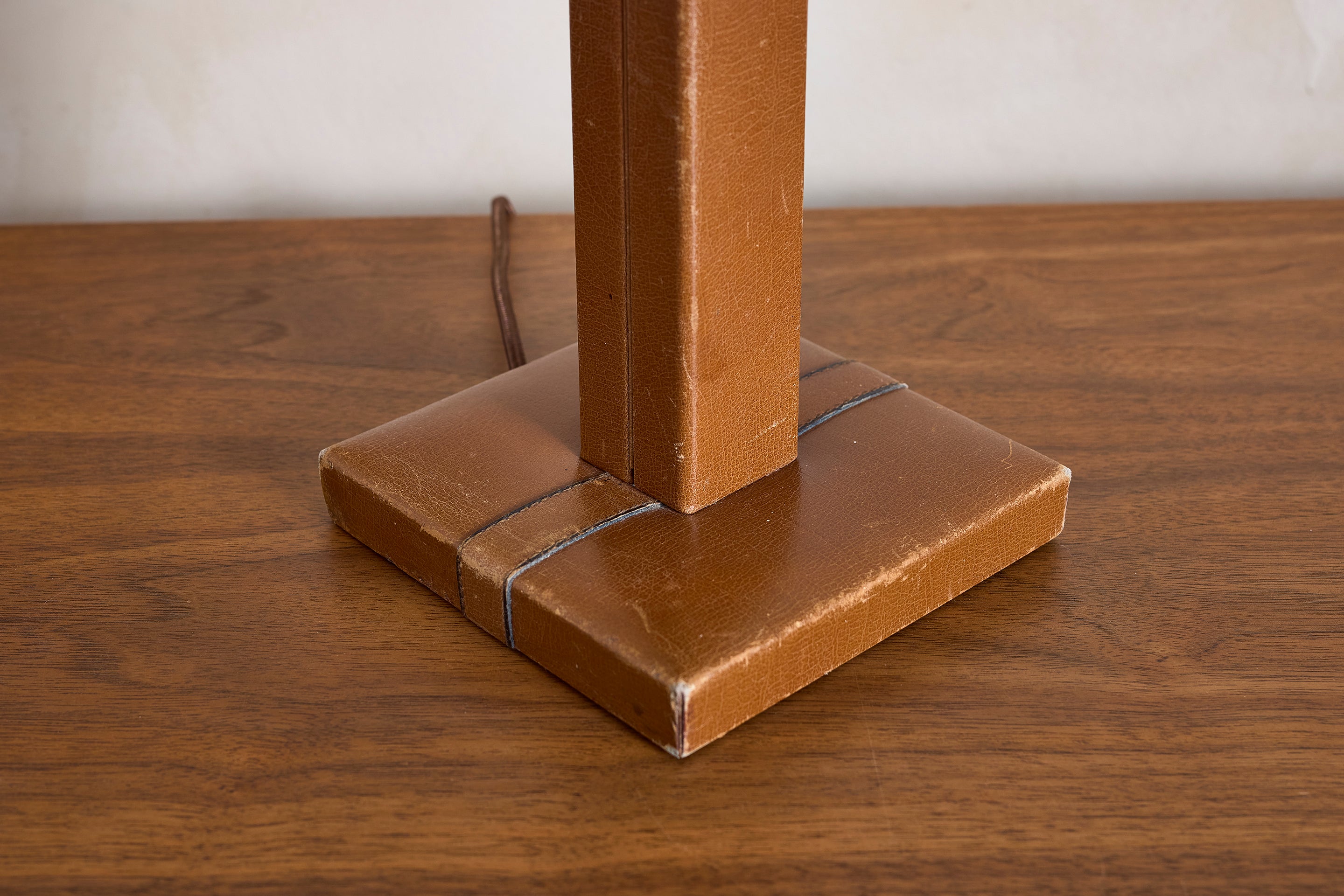 Jacques Adnet style table lamp in aged camel brown leather with signature stitching. New silk shade and newly rewired. : 21"H x 12"D Materials: Leather... View full product details