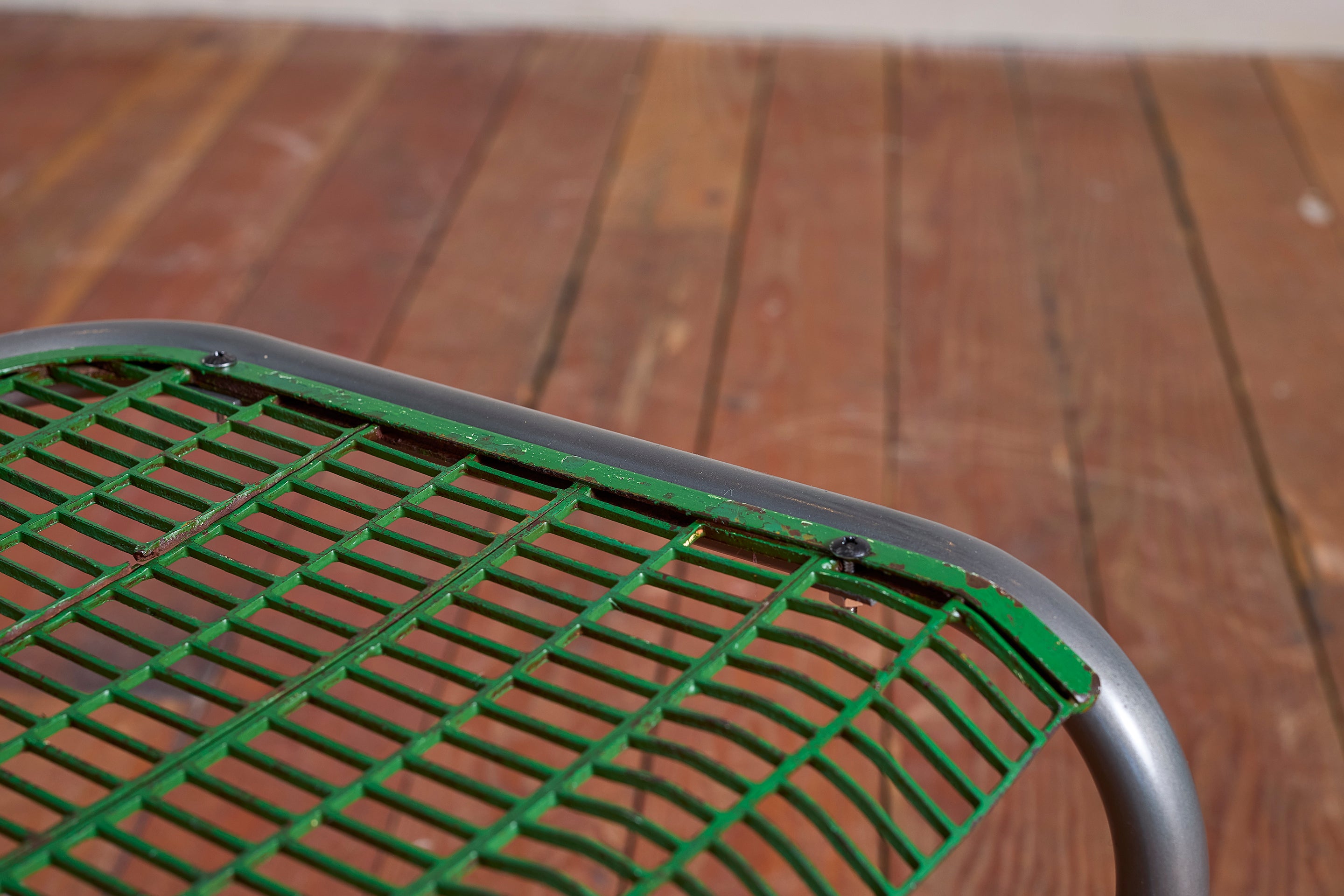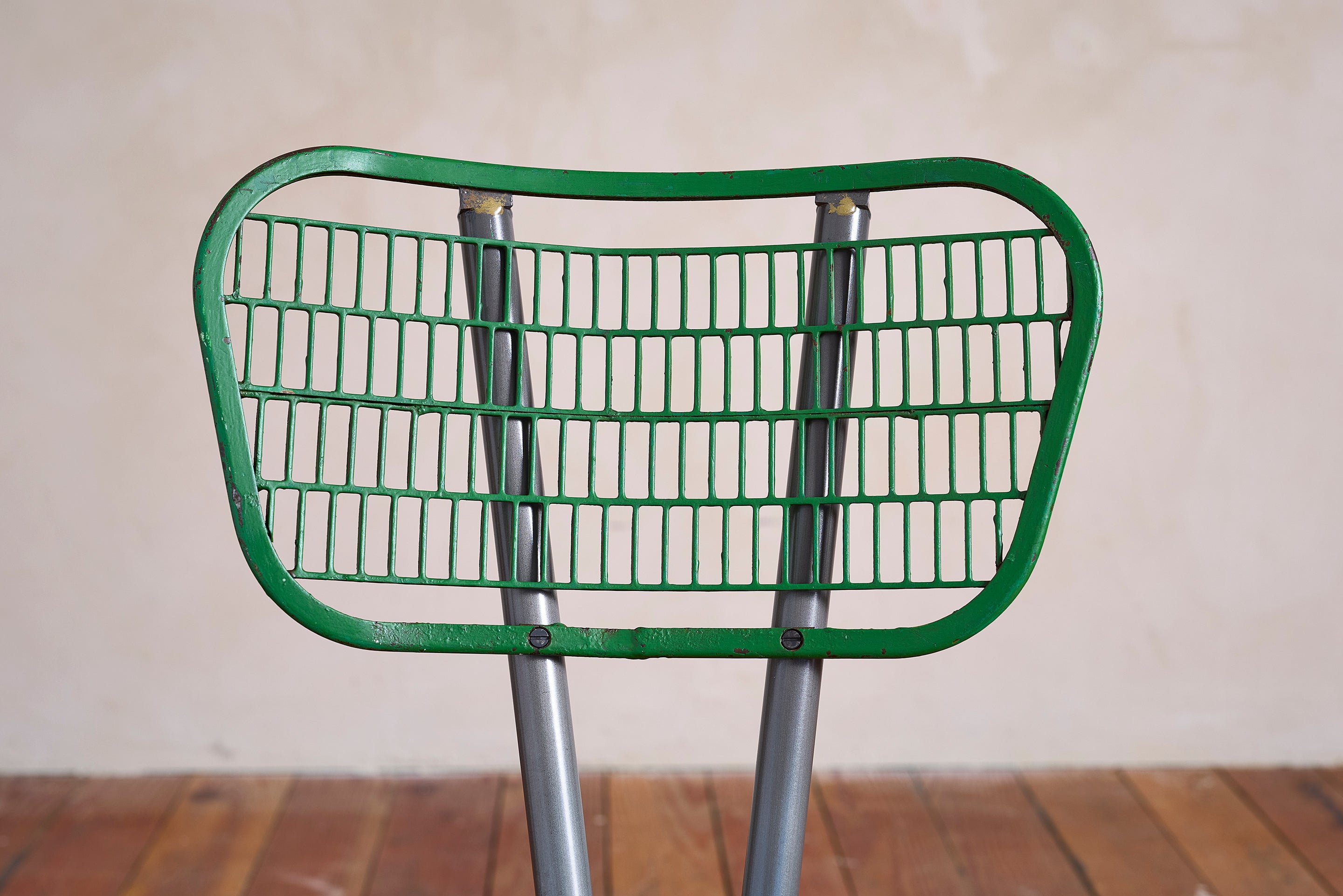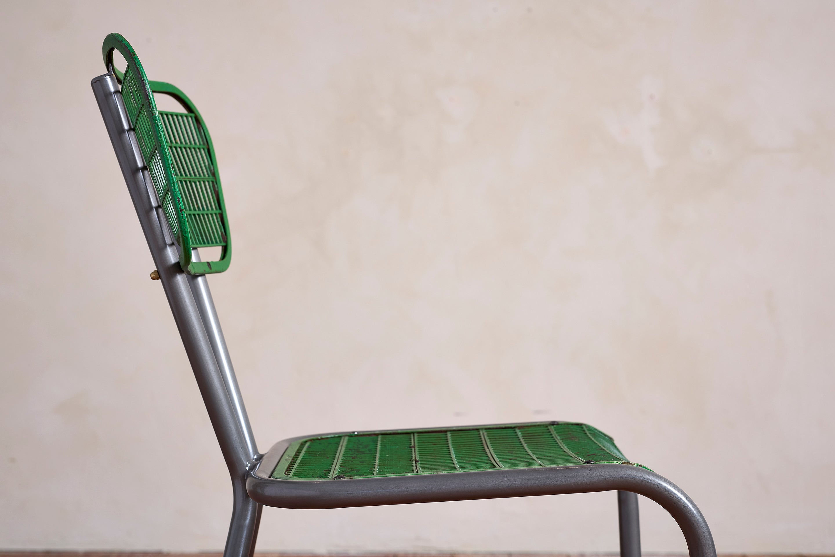 Set of 4 perforated French steel chairs by Rene Malaval — France 1950's Original green seats with back with polished iron frame. Post war French... View full product details