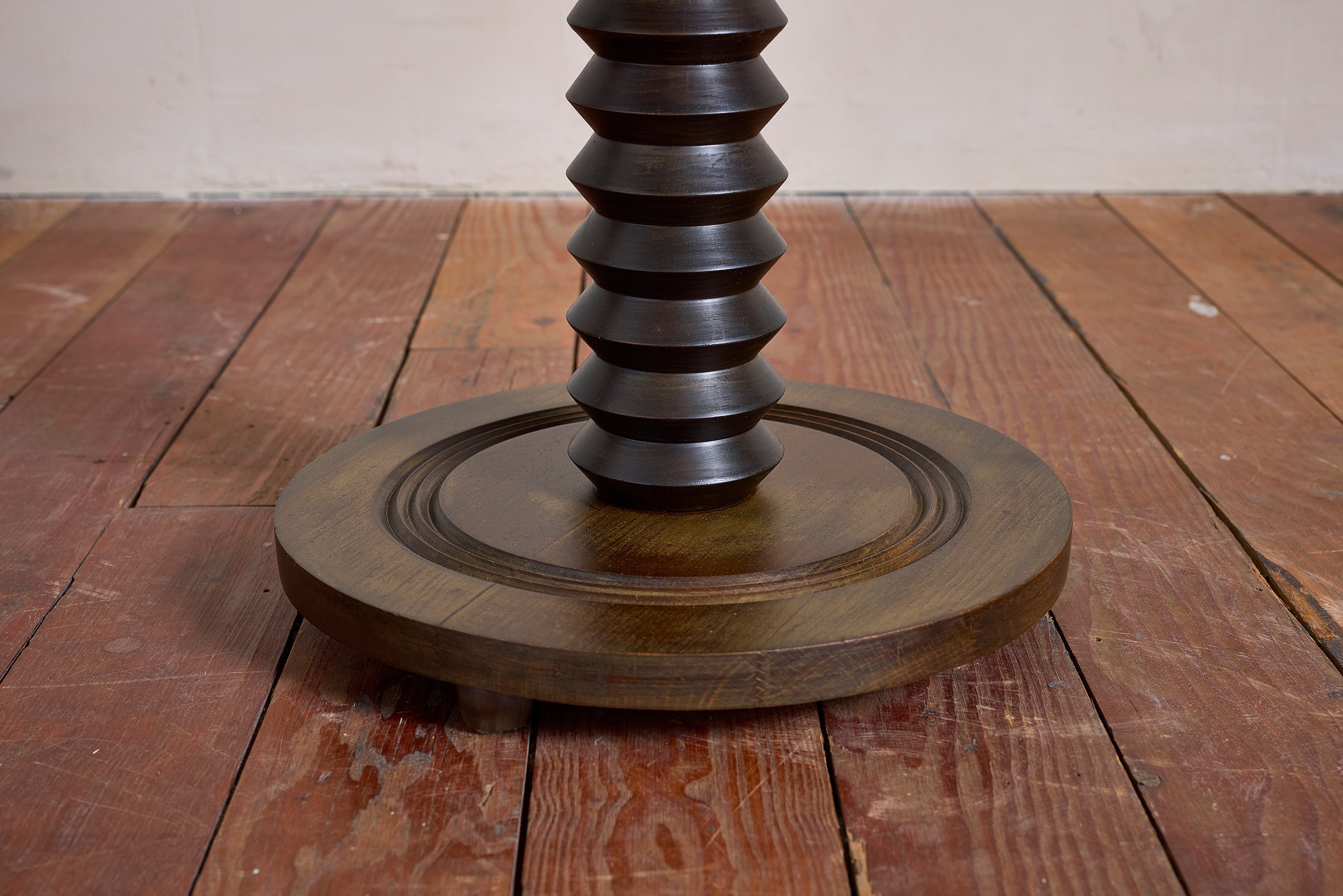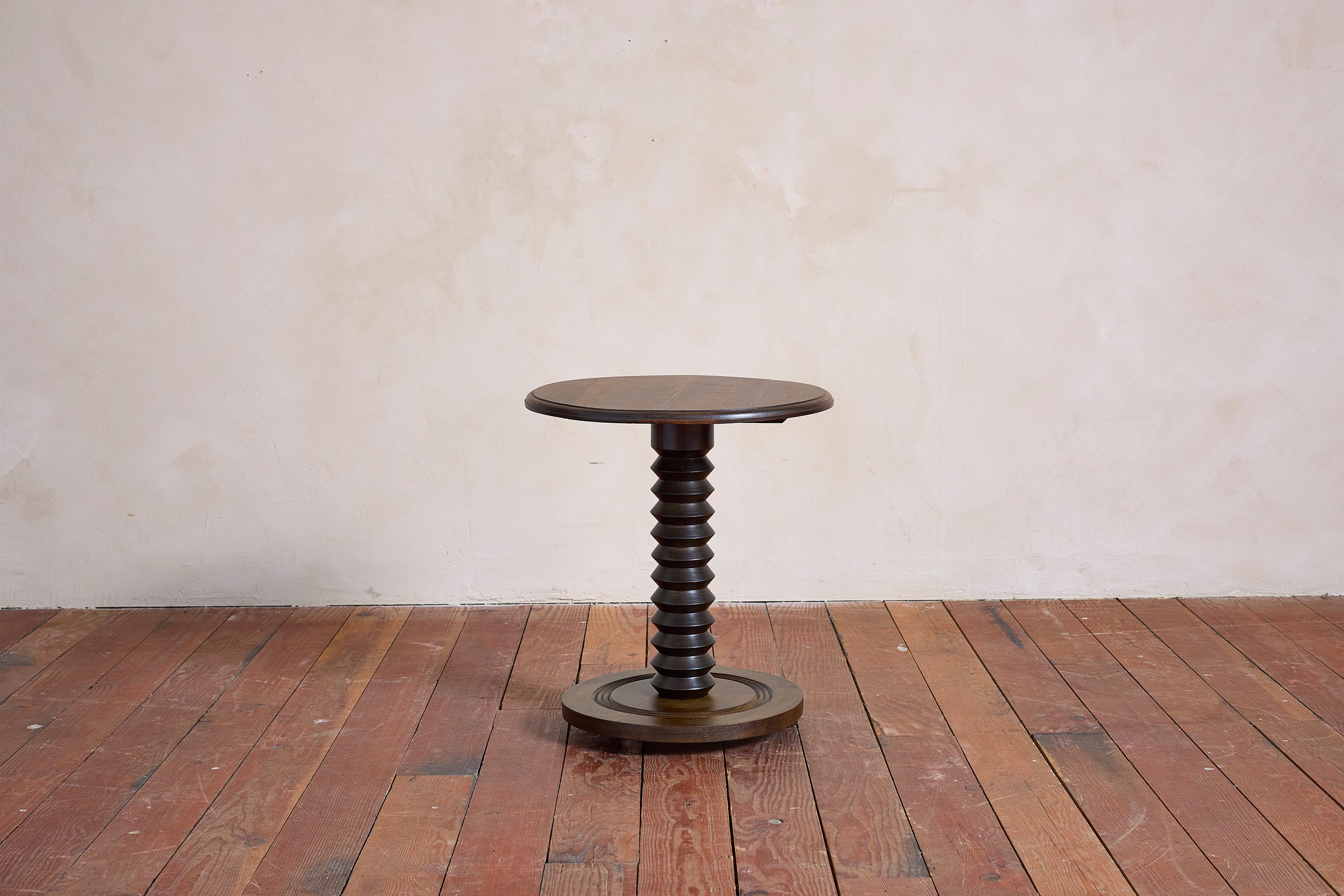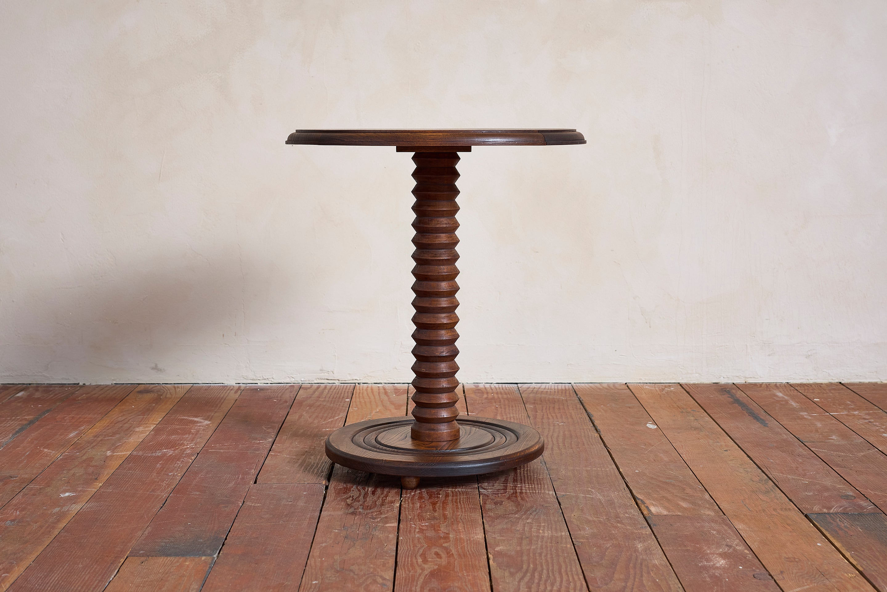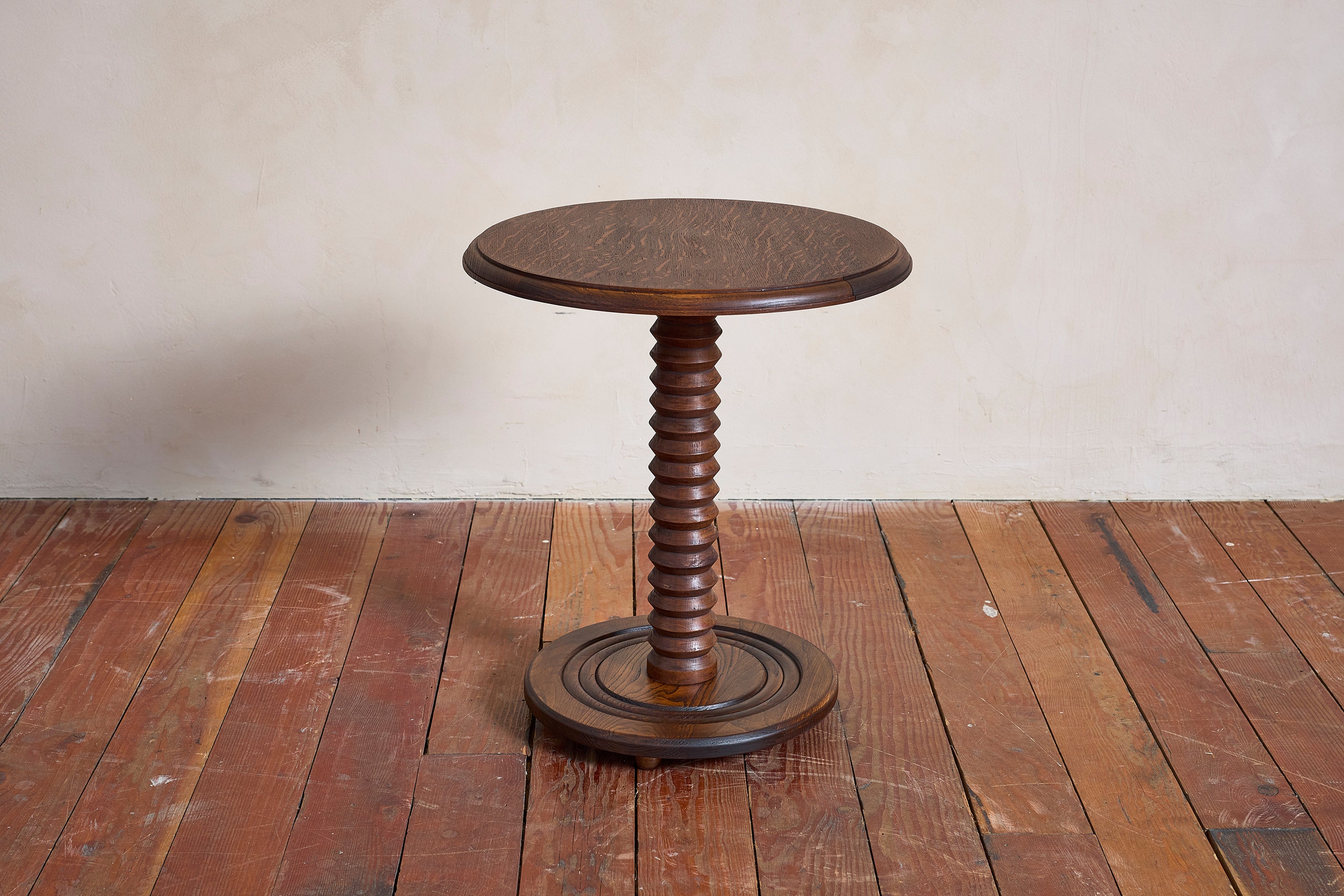 Charles Dudouyt side table with signature corkscrew base - France, 1940s Pedestal with circular concentric base. Wonderful dark patina. : 22"H x 19.75"D Materials: Oak... View full product details