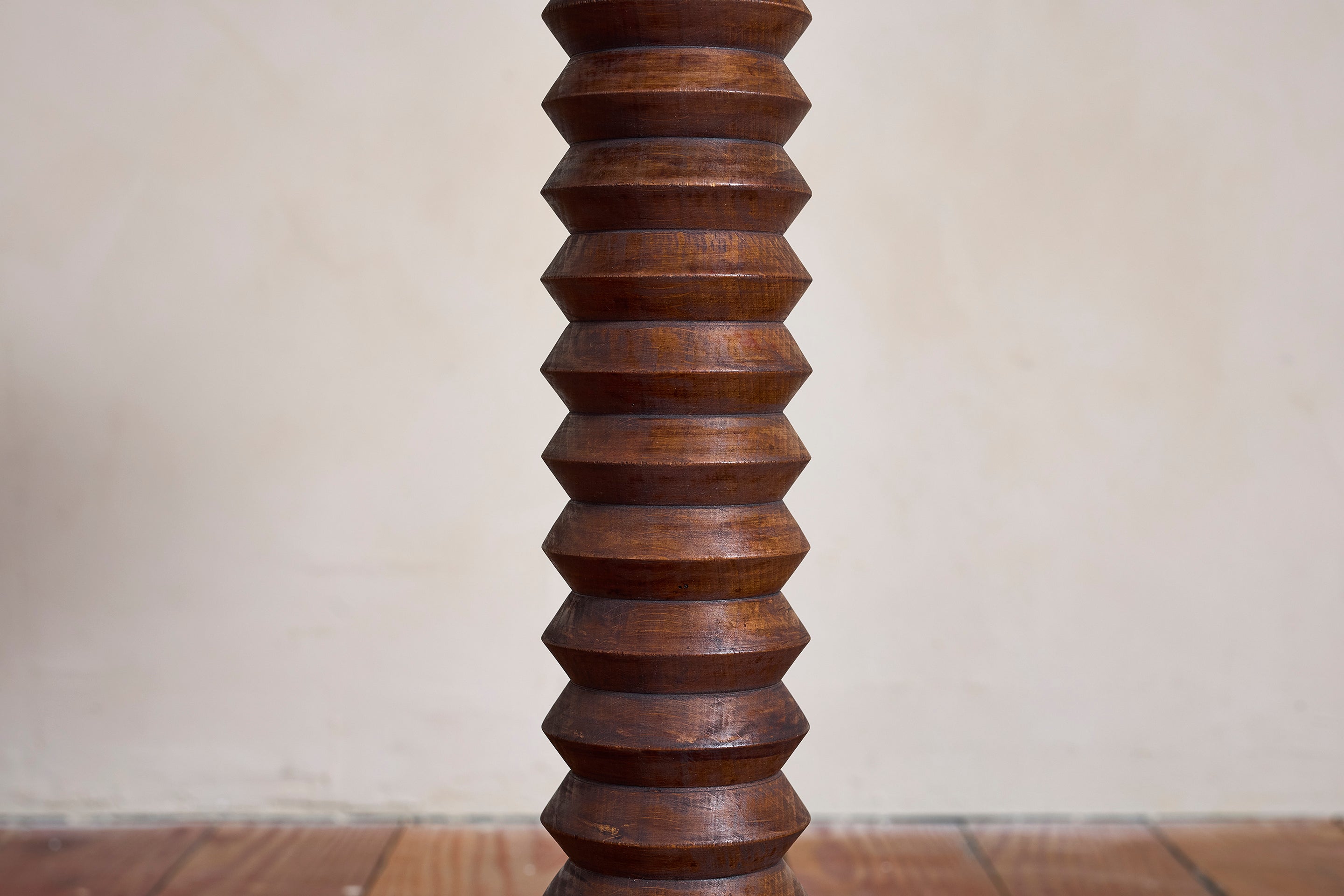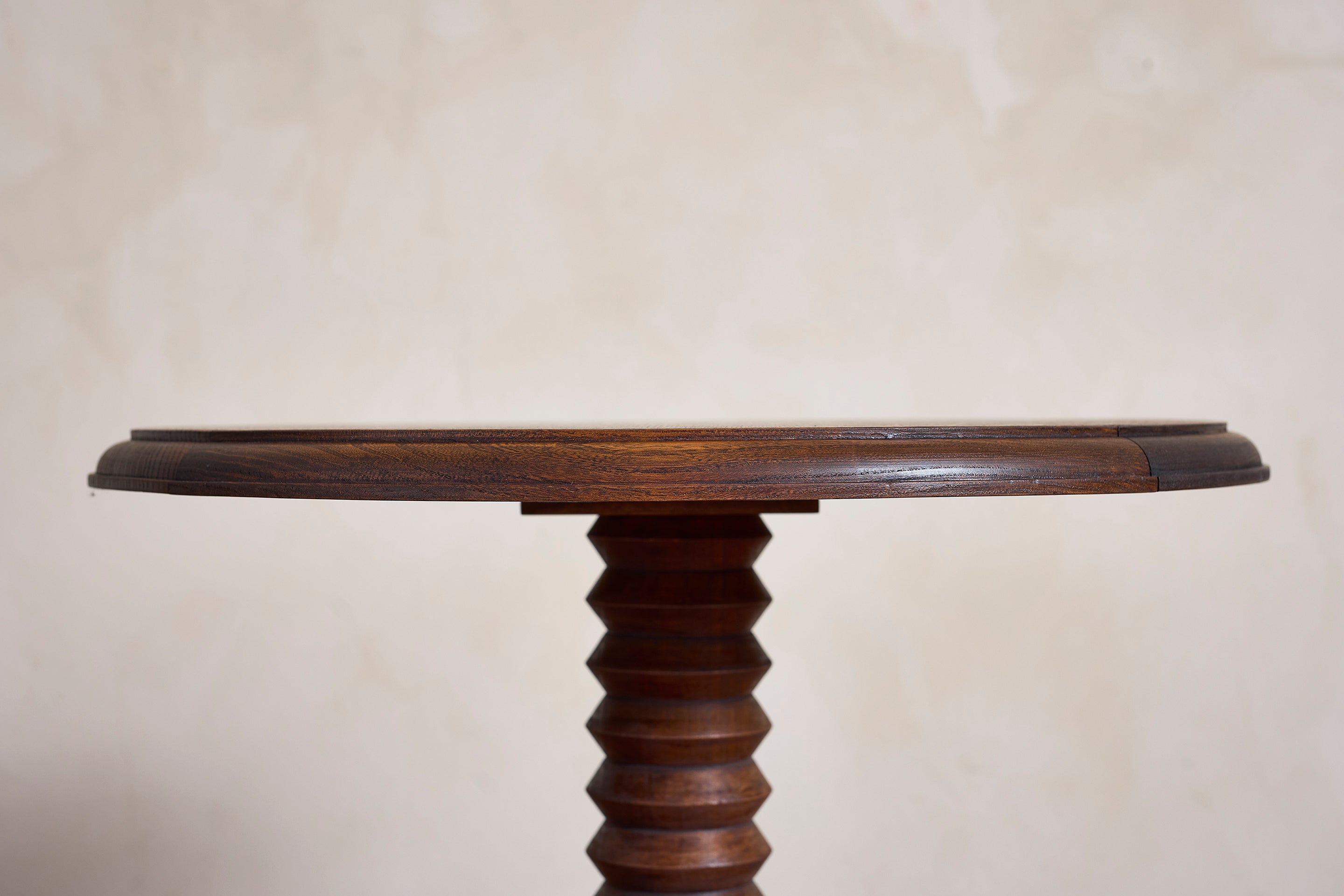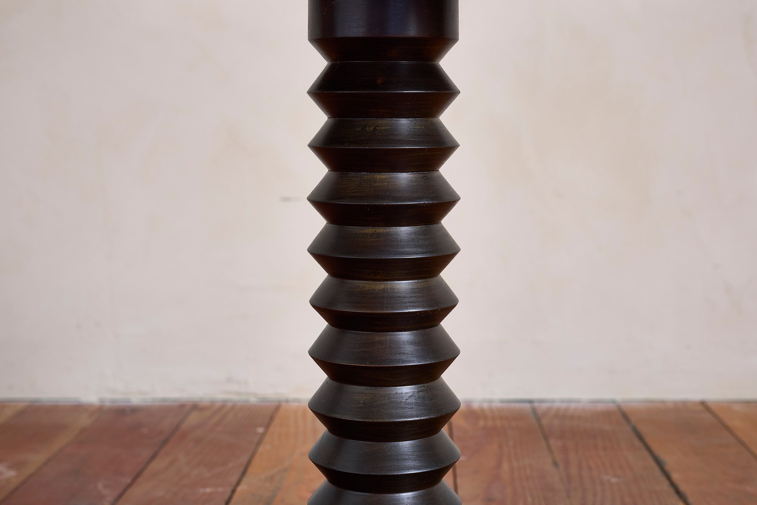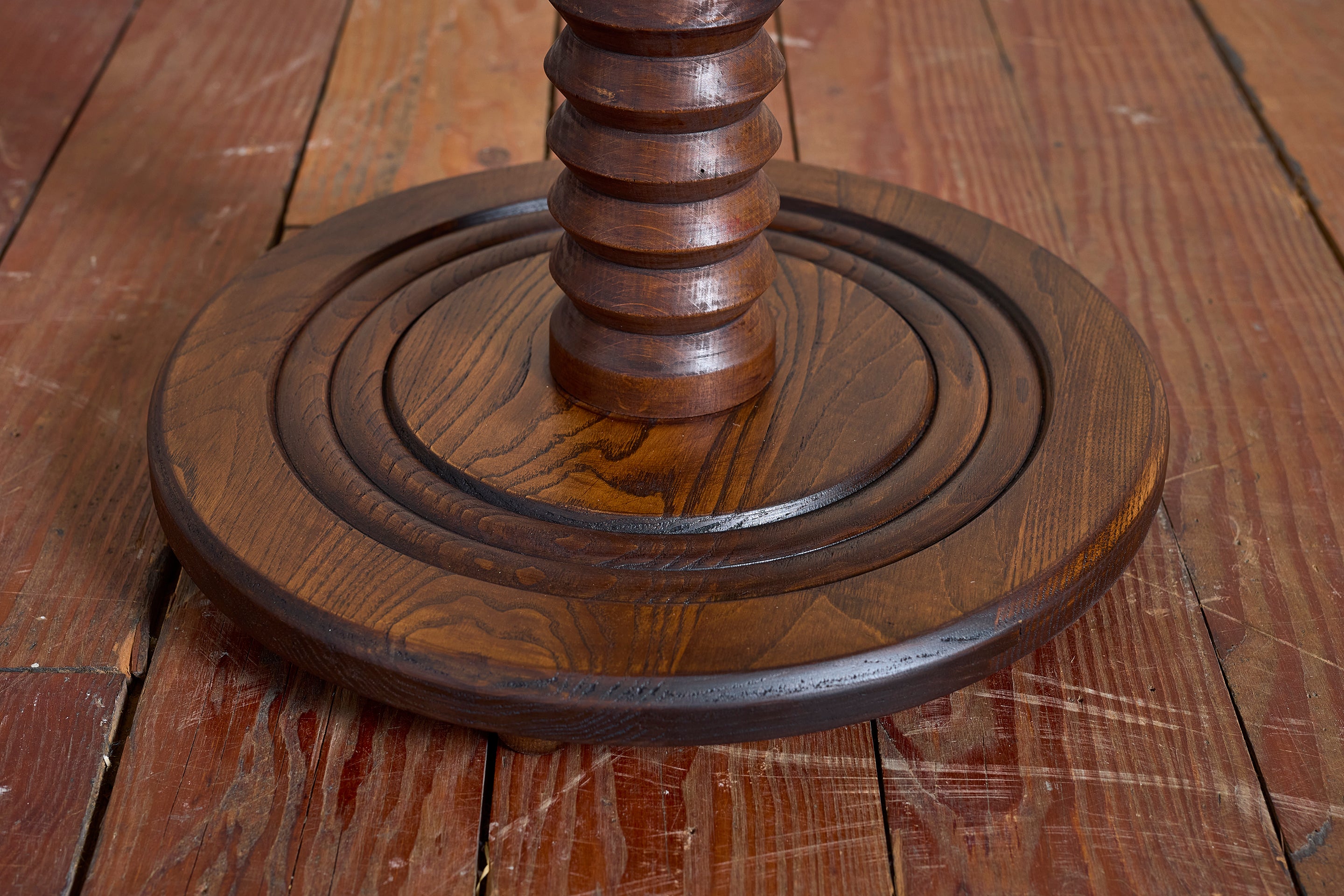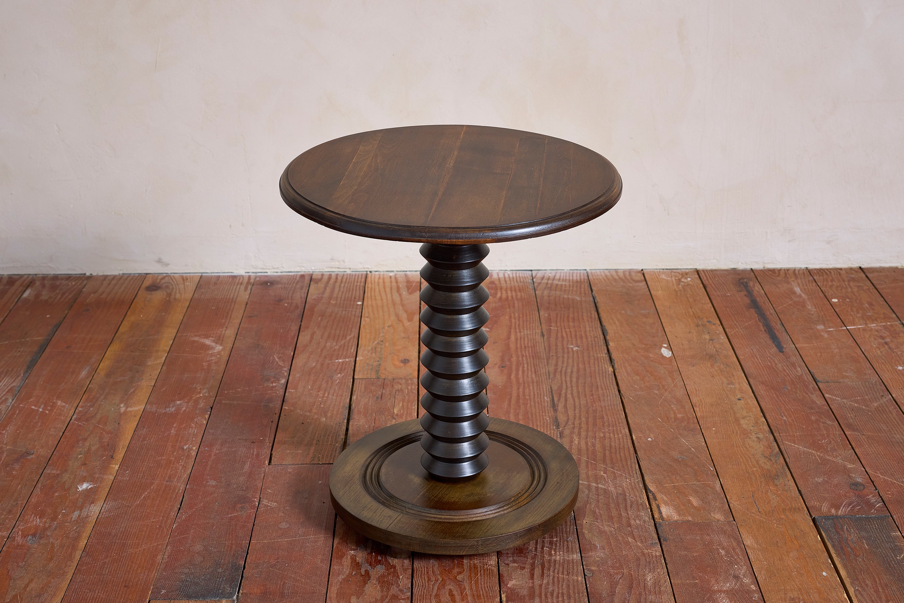 Charles Dudouyt side table with signature corkscrew base - France, 1940s Pedestal with circular concentric base. Wonderful dark patina. : 22"H x 19.75"D Materials: Oak... View full product details