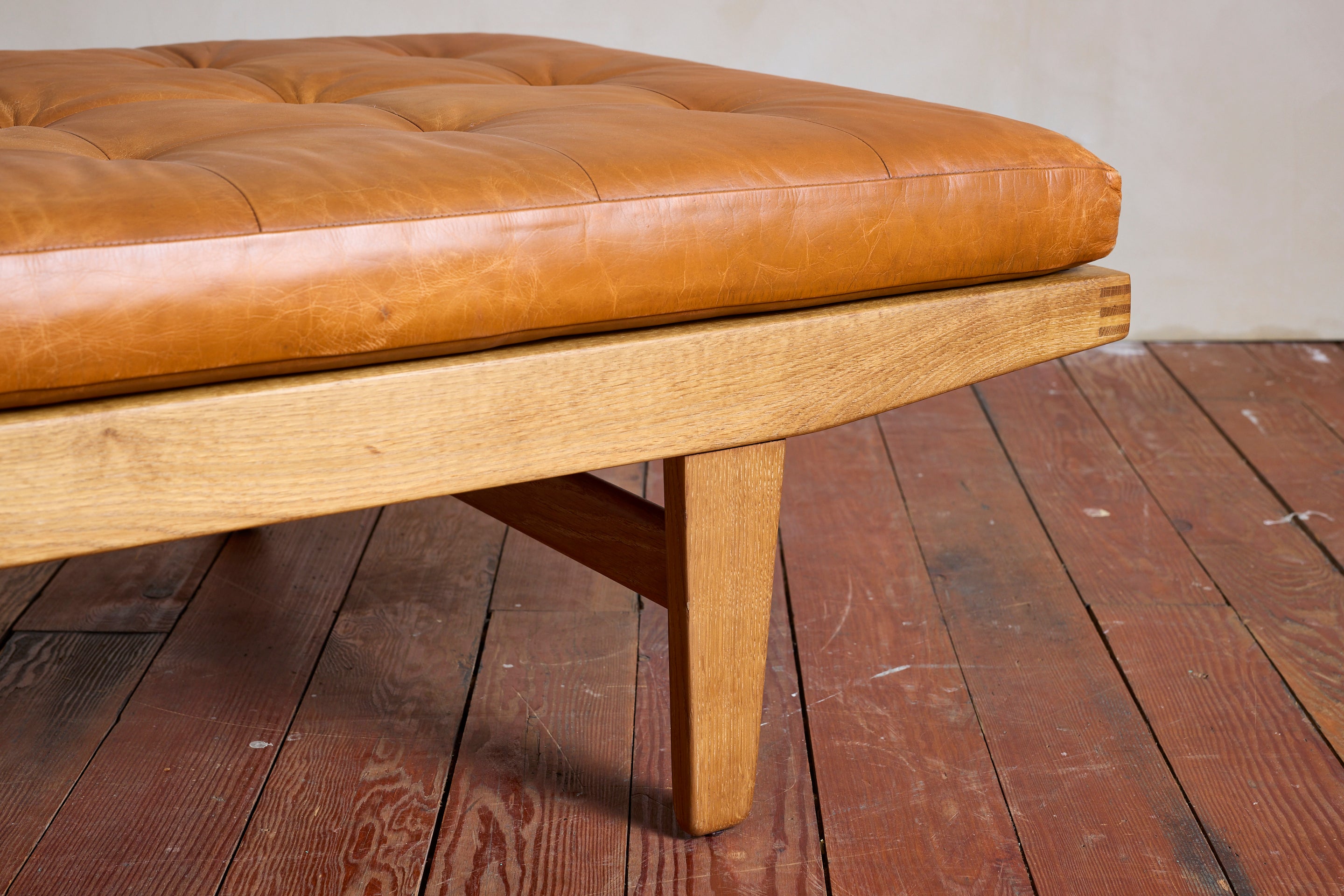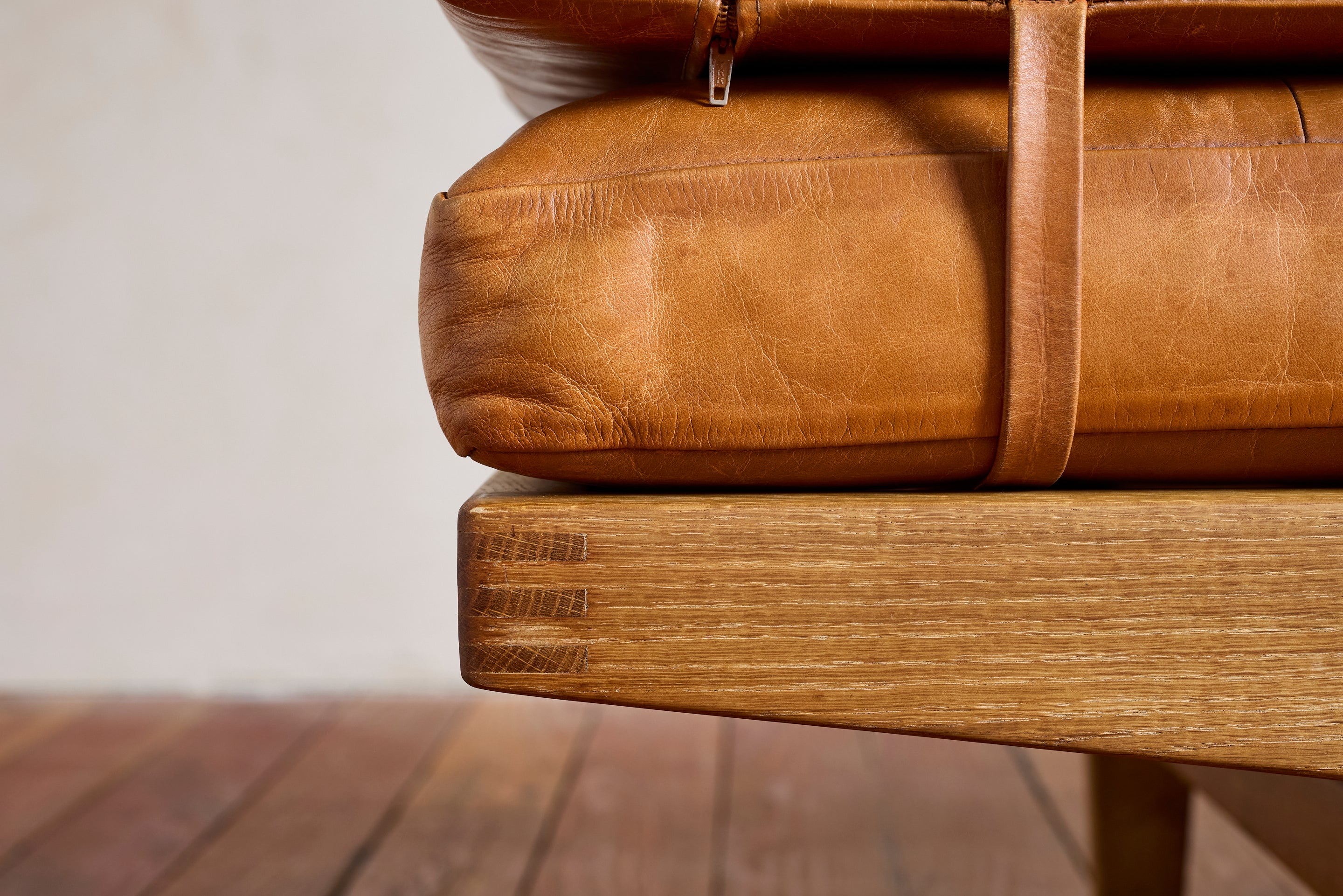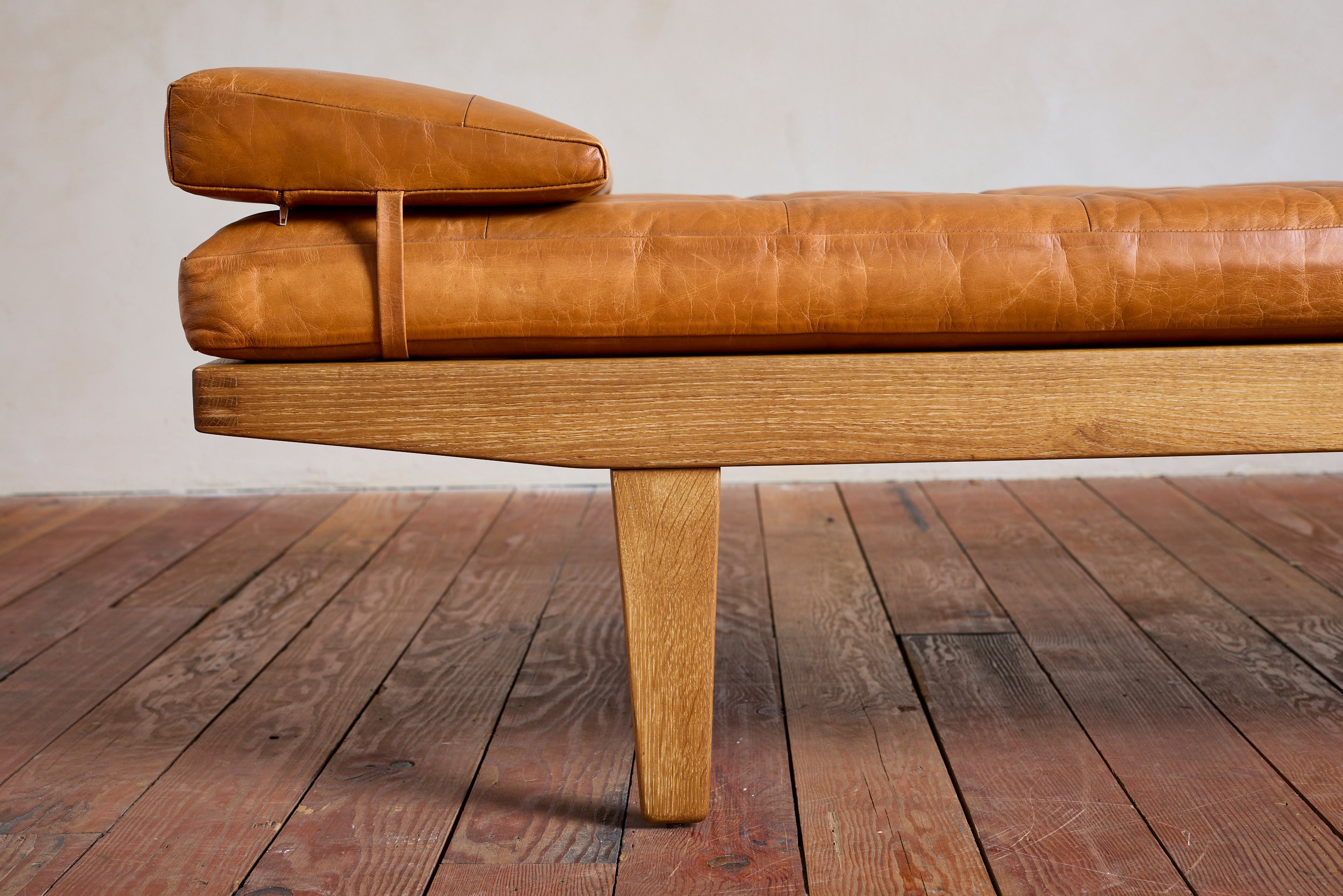 ABOUT Wonderful daybed by Poul Volther in beautifully aged saddle leather with tufted cushion and wedged pillow. Simple slatted warm oak wood frame. Circa 1950s.... View full product details