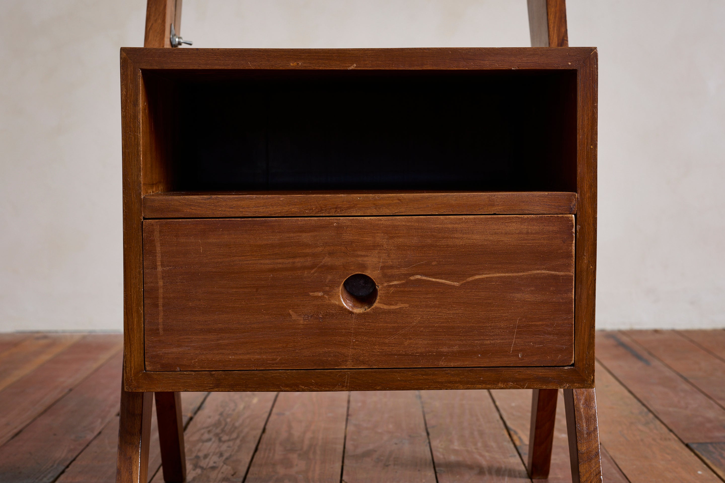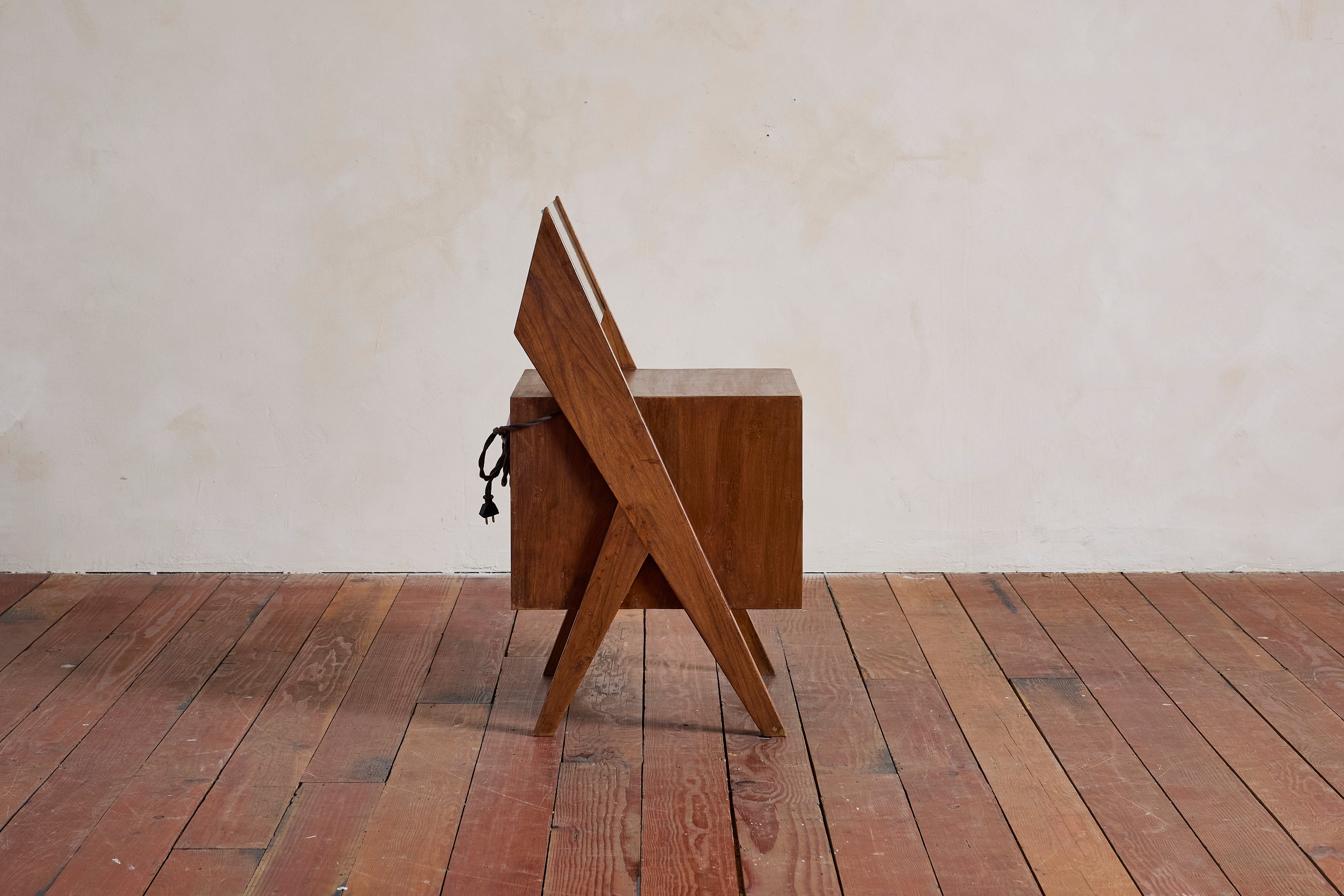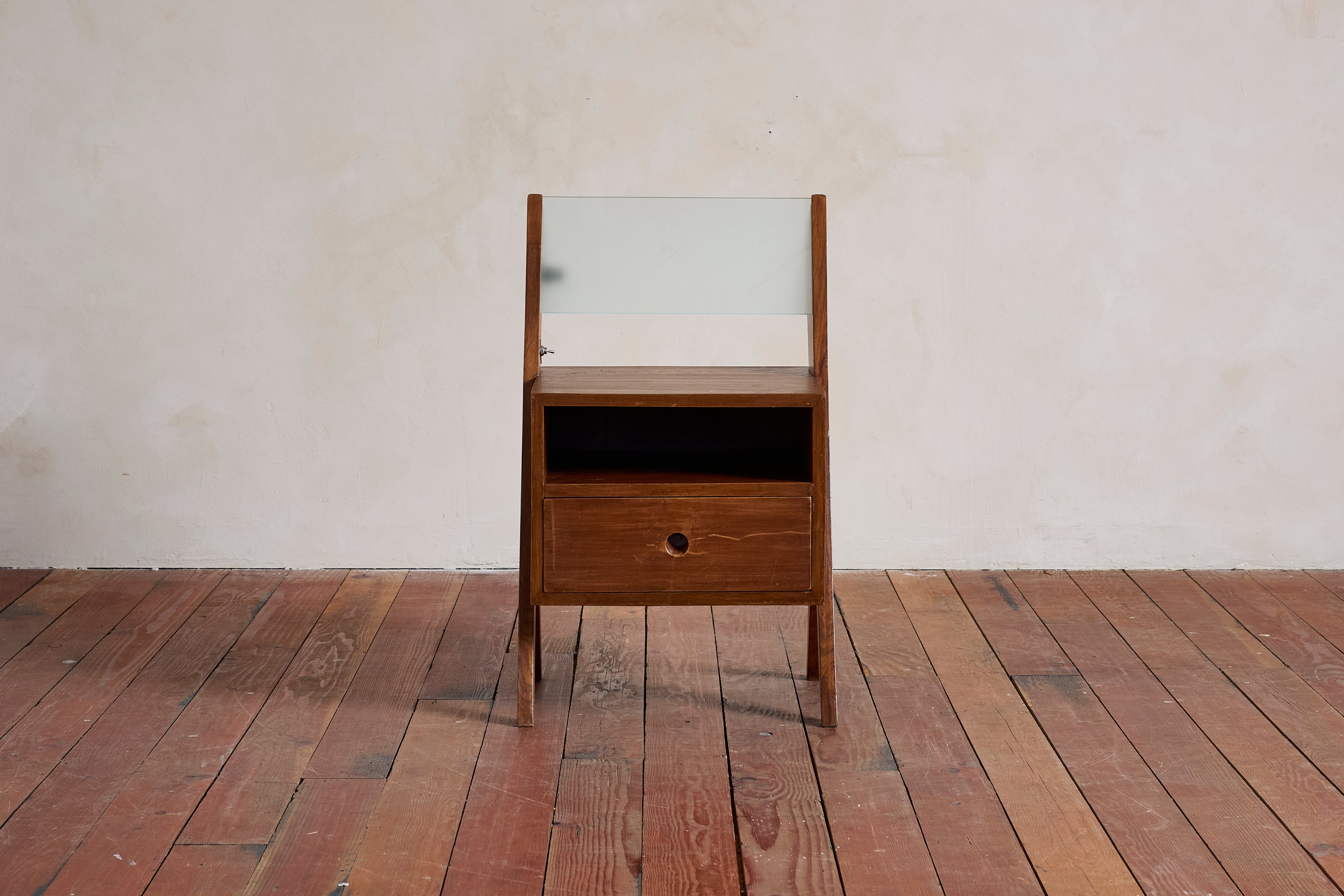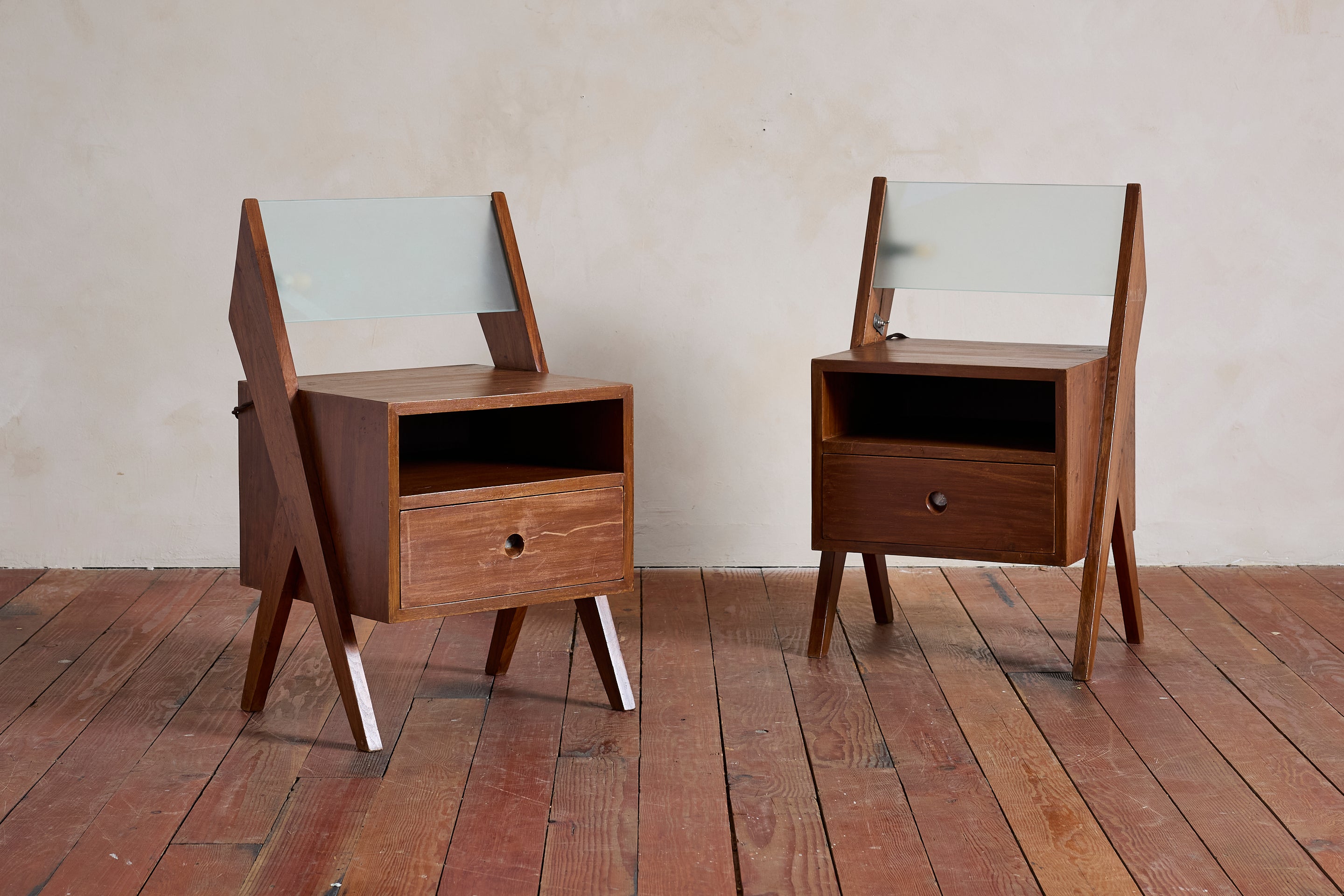 ABOUT Incredible rare pair of Pierre Jeanneret Nightstands, Chandigarh Signature angled shaped leg with original frosted glass illuminating light featured into the design. Original stenciled... View full product details