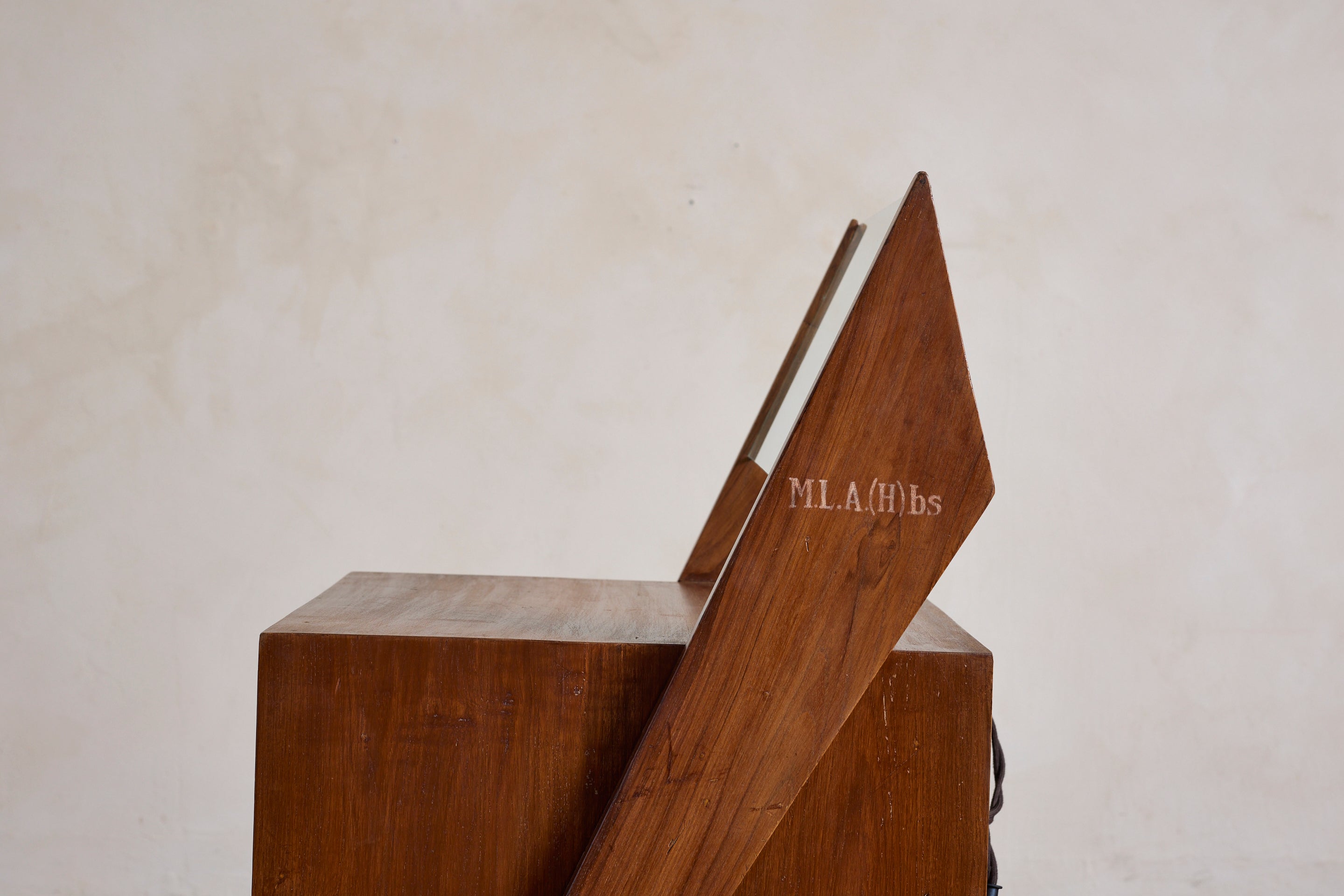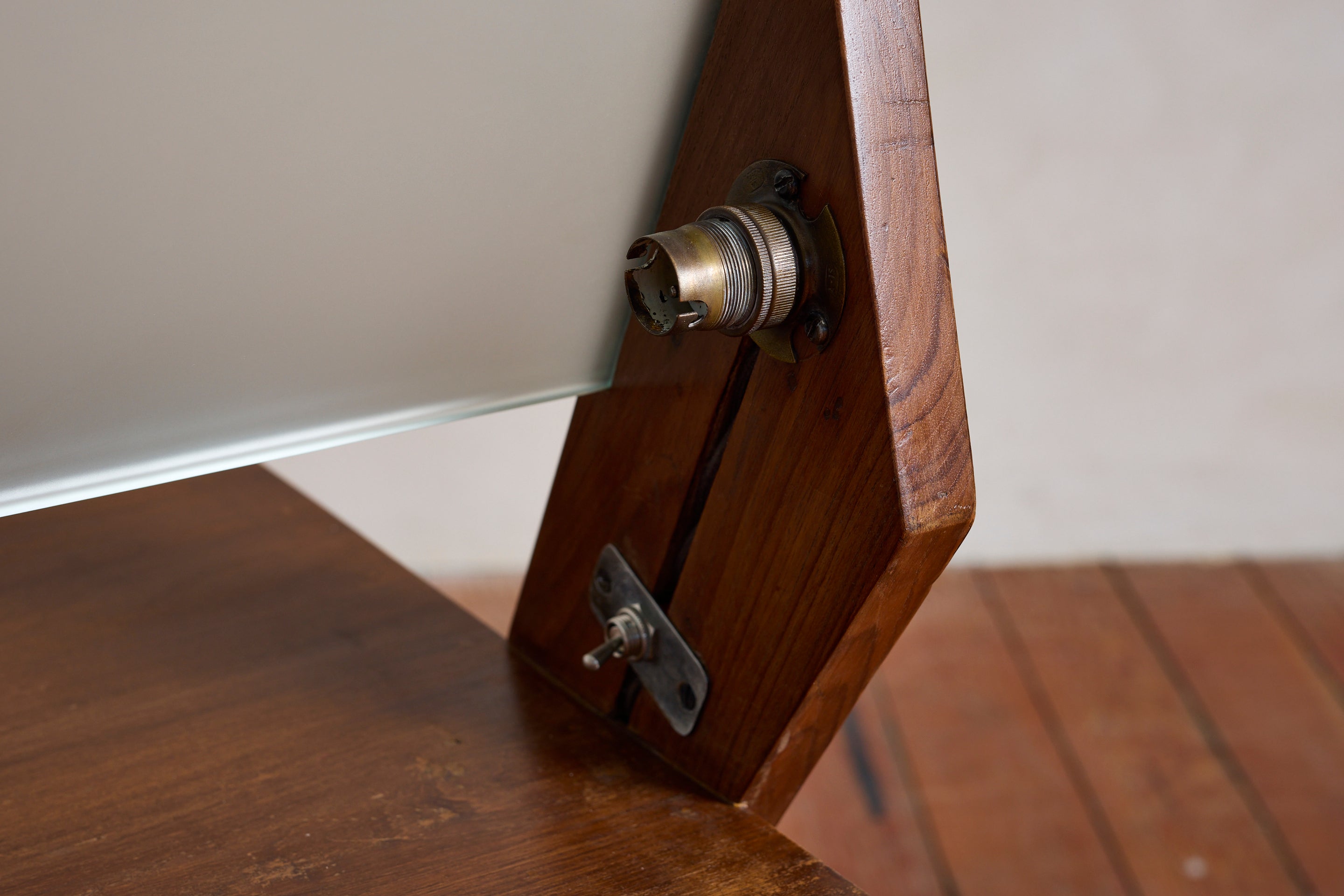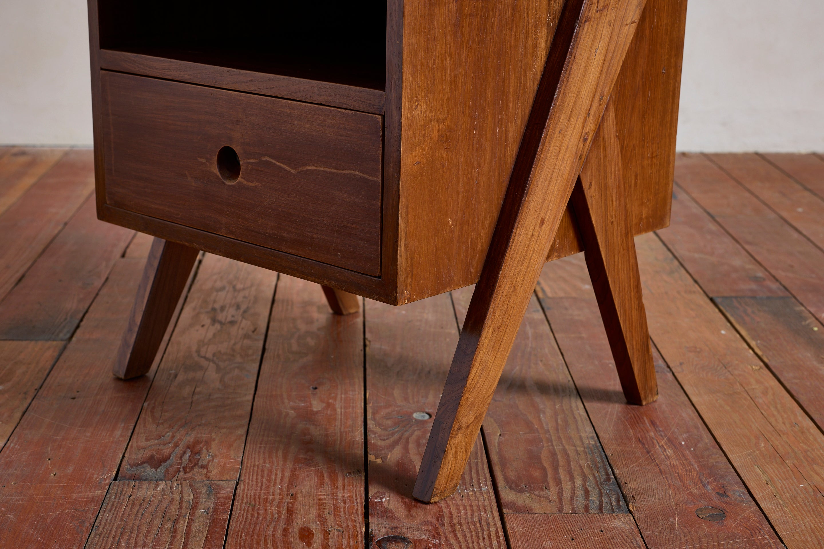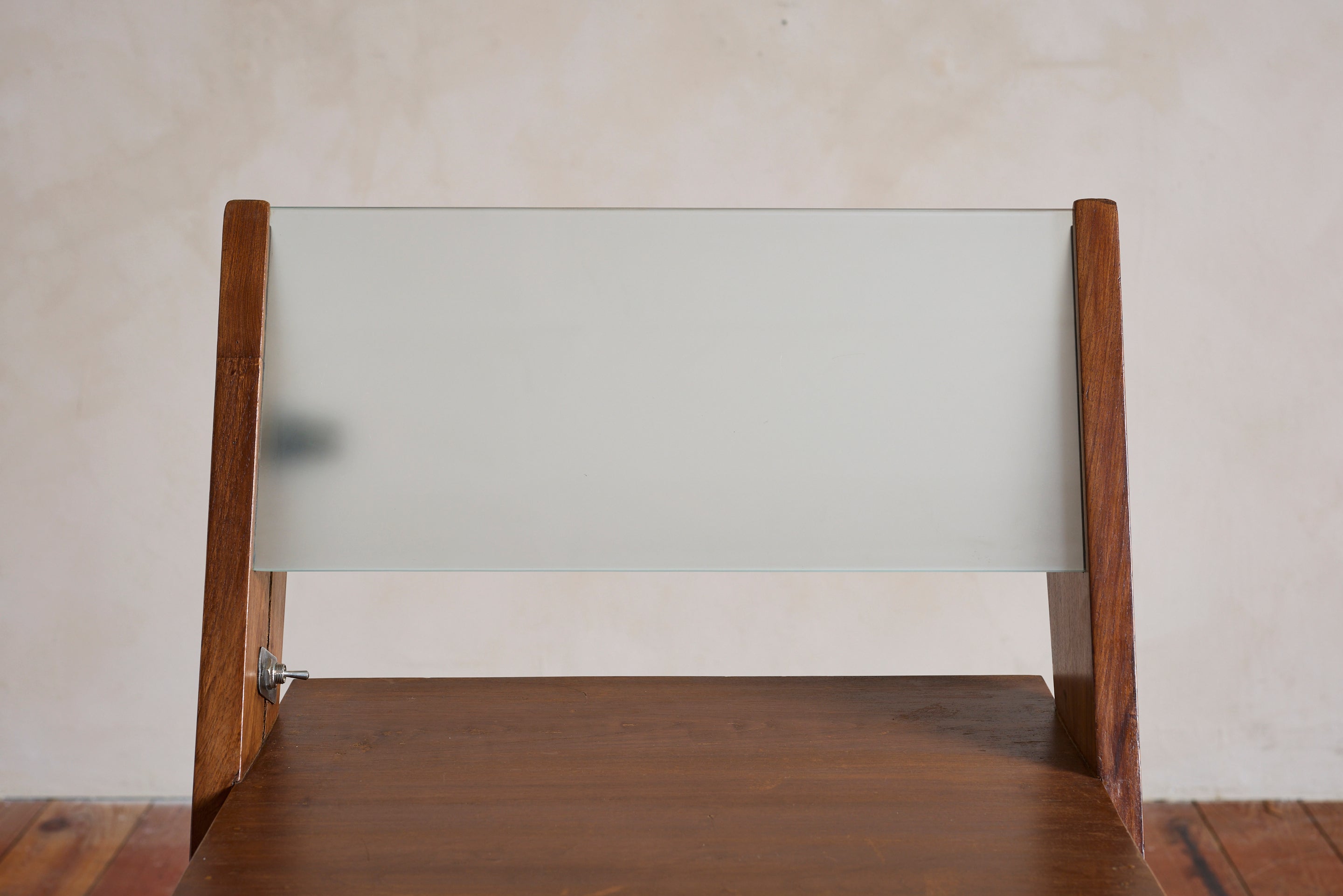 ABOUT Incredible rare pair of Pierre Jeanneret Nightstands, Chandigarh Signature angled shaped leg with original frosted glass illuminating light featured into the design. Original stenciled... View full product details