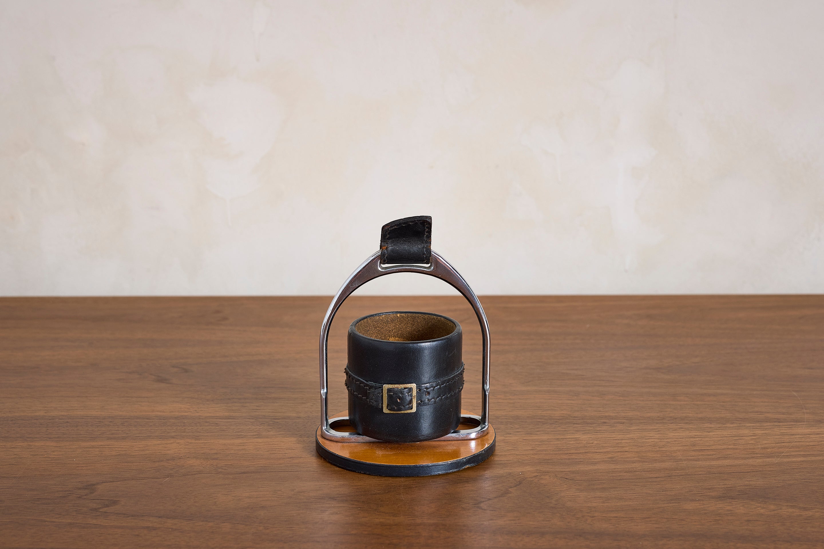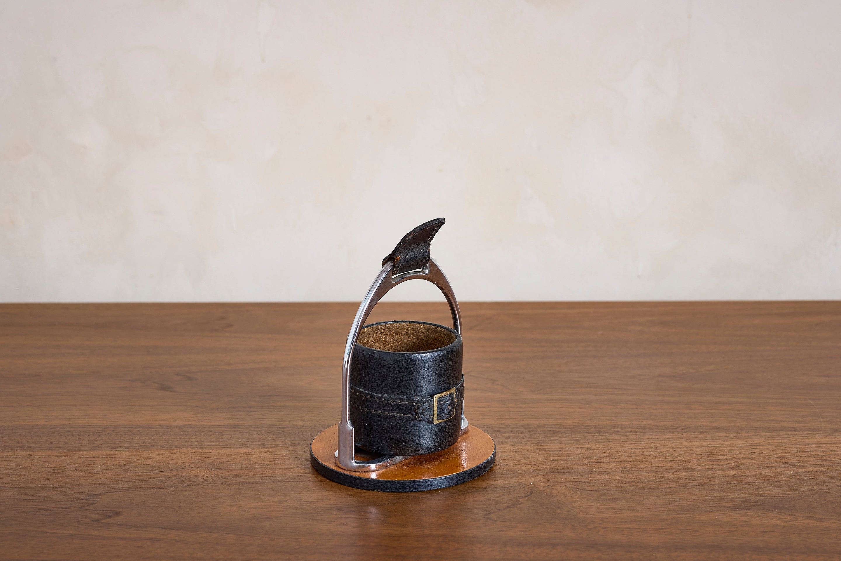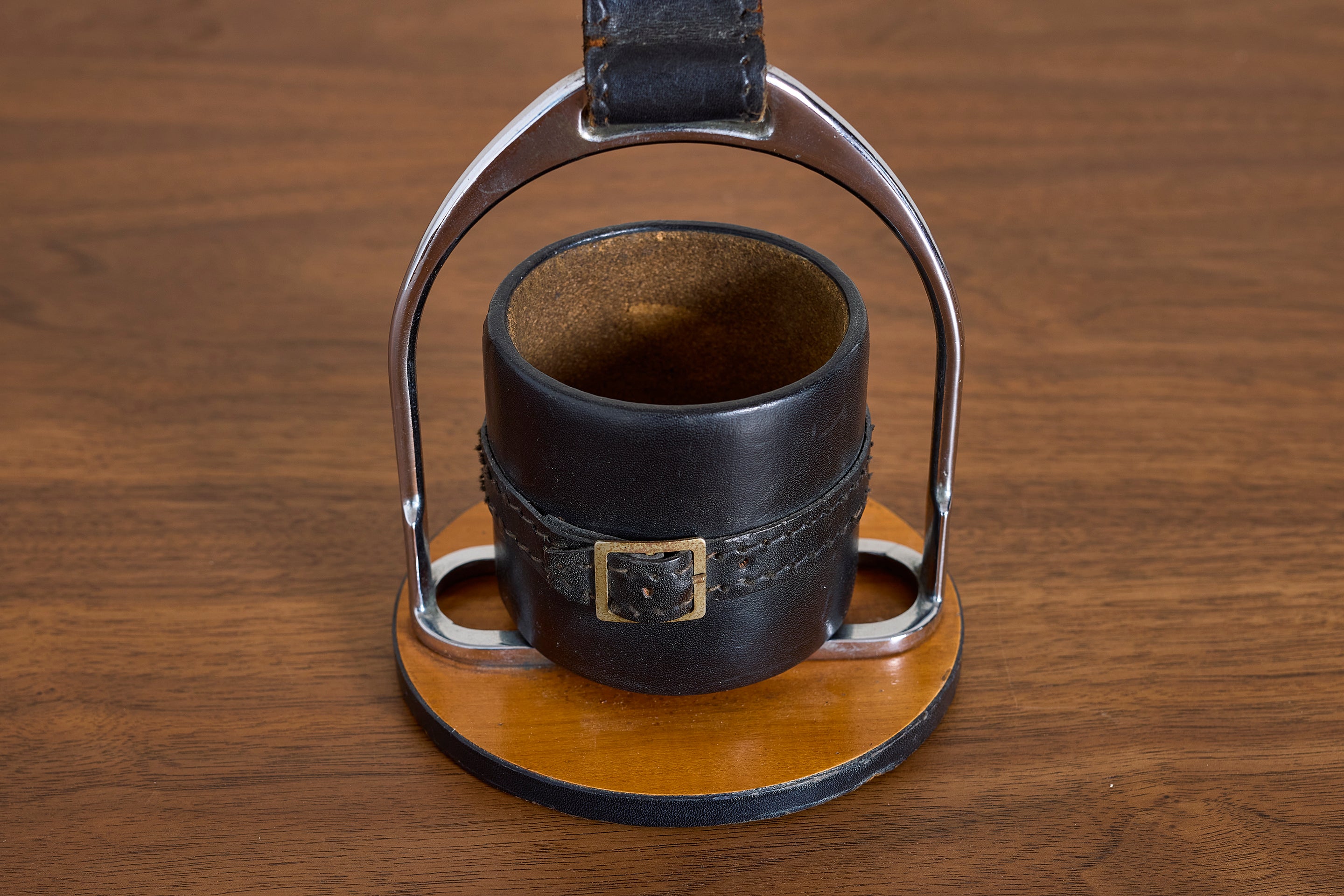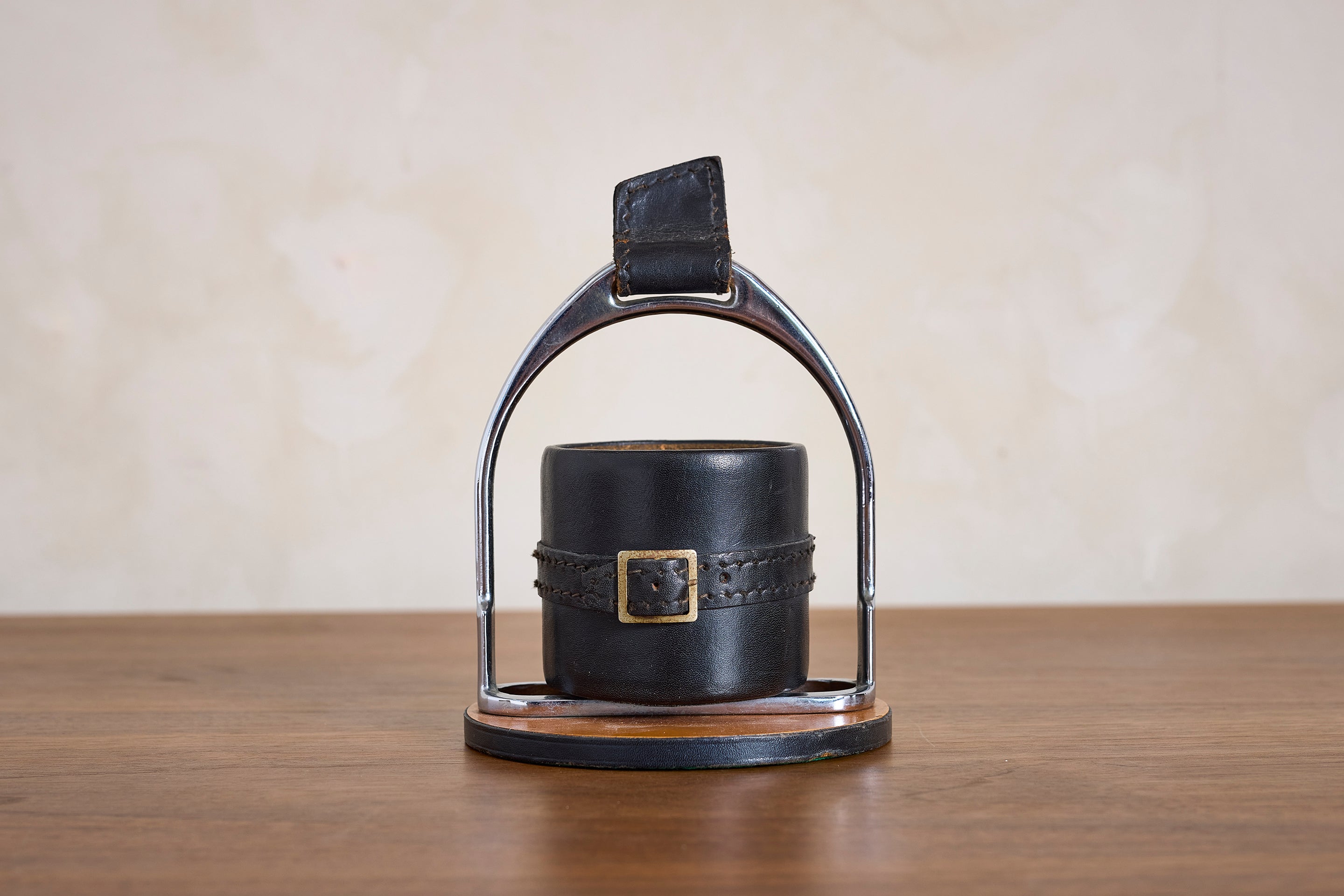 Simple Adnet Catch all in black leather, nickel hardware and equestrian buckle. : 7"H x 5"W x 5"D Materials: Leather Place of Origin: France Period:... View full product details