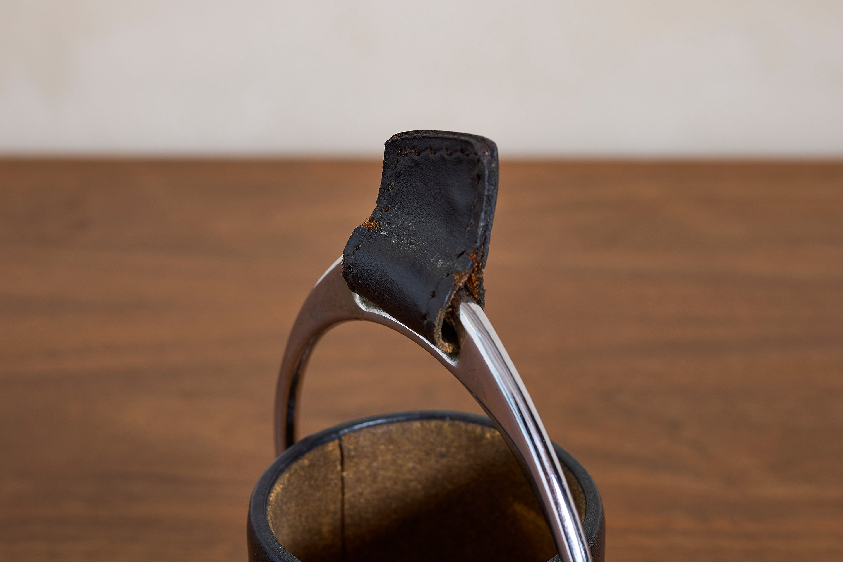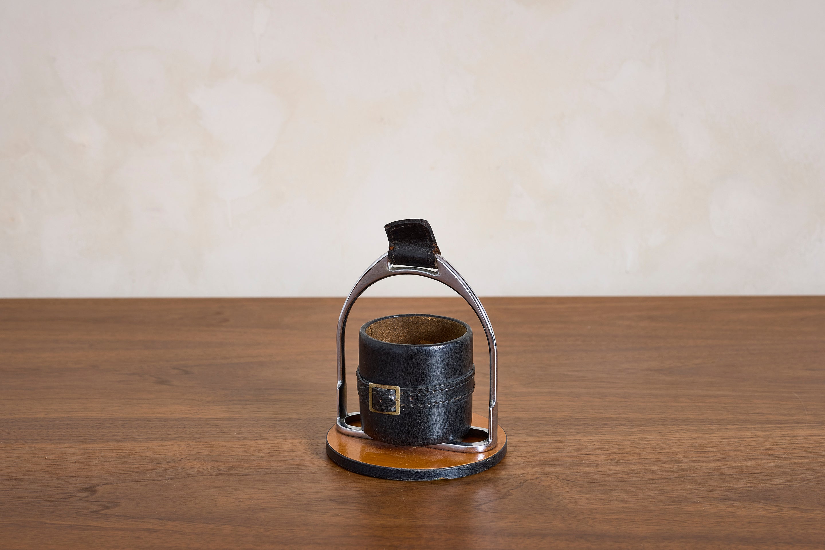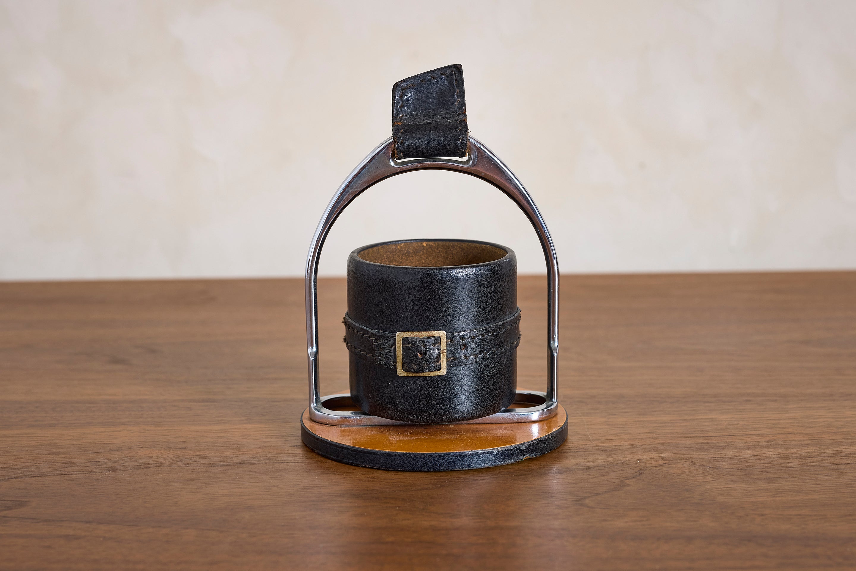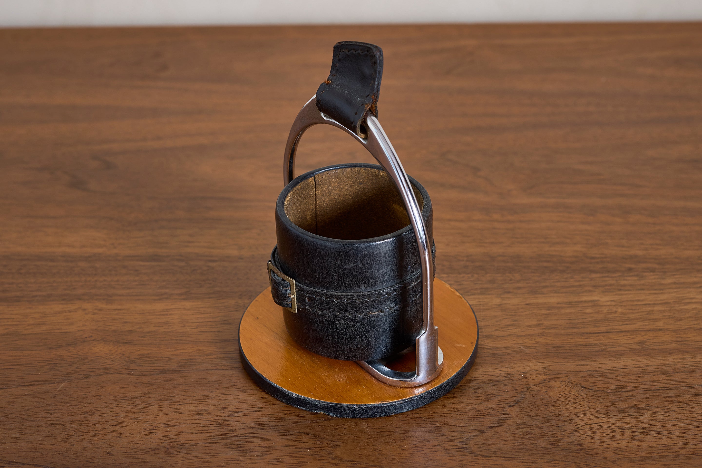 Simple Adnet Catch all in black leather, nickel hardware and equestrian buckle. : 7"H x 5"W x 5"D Materials: Leather Place of Origin: France Period:... View full product details