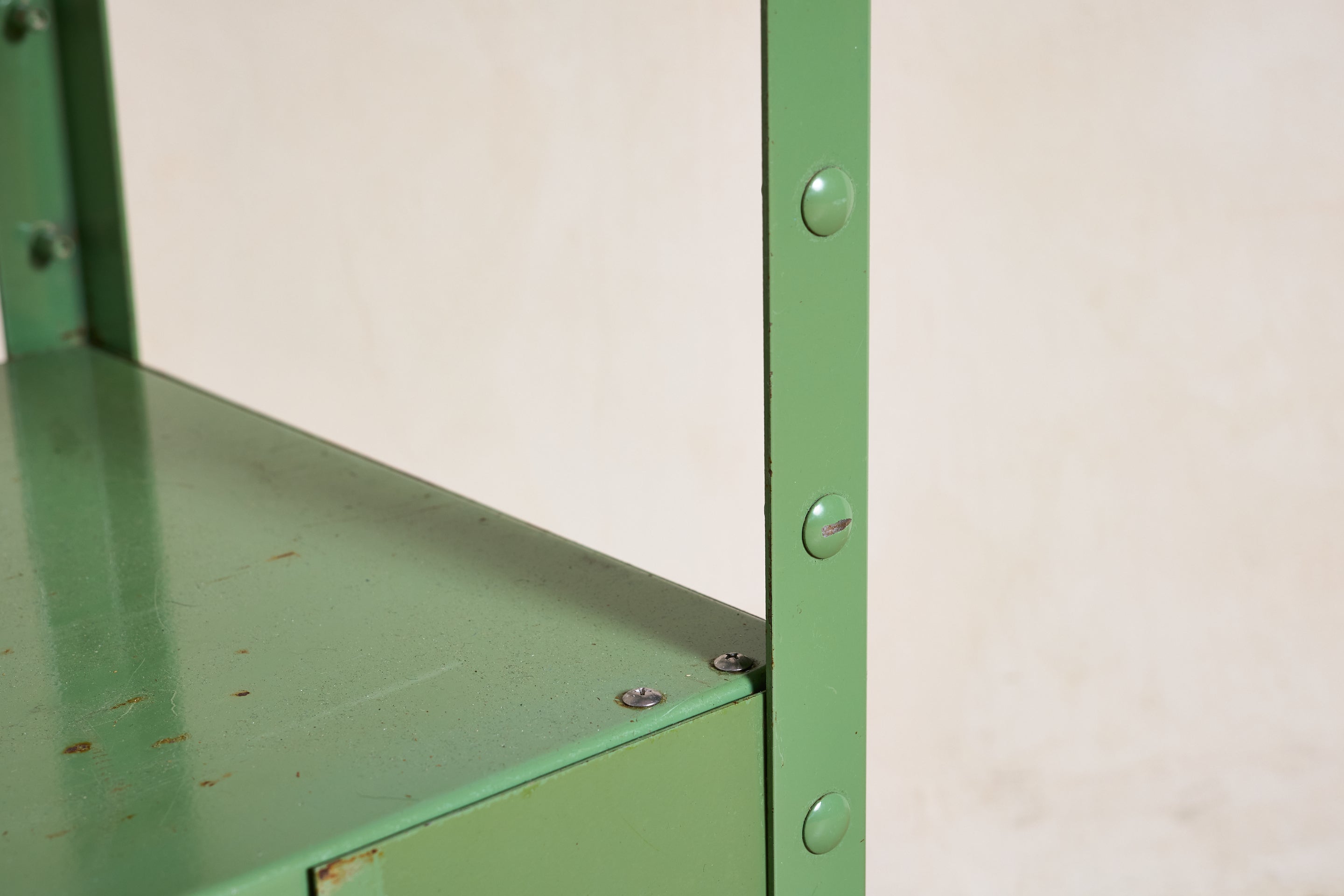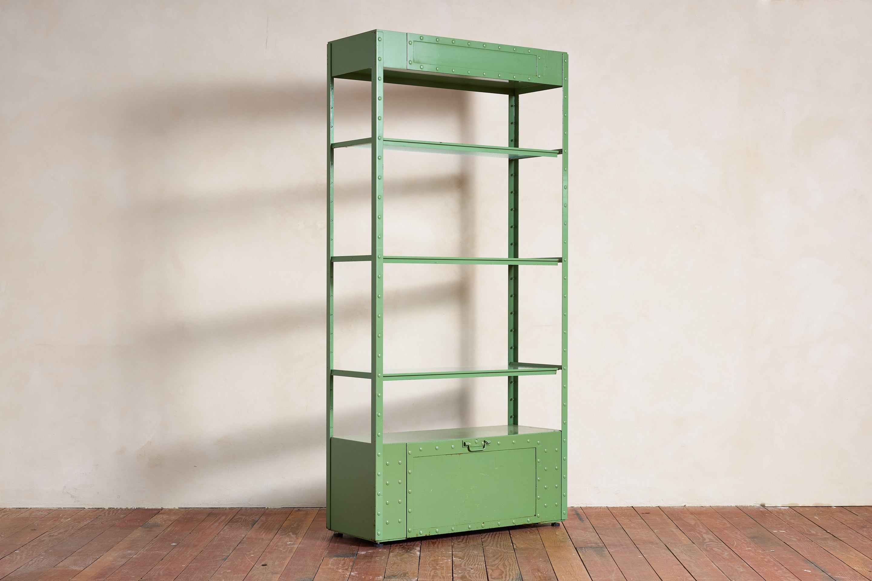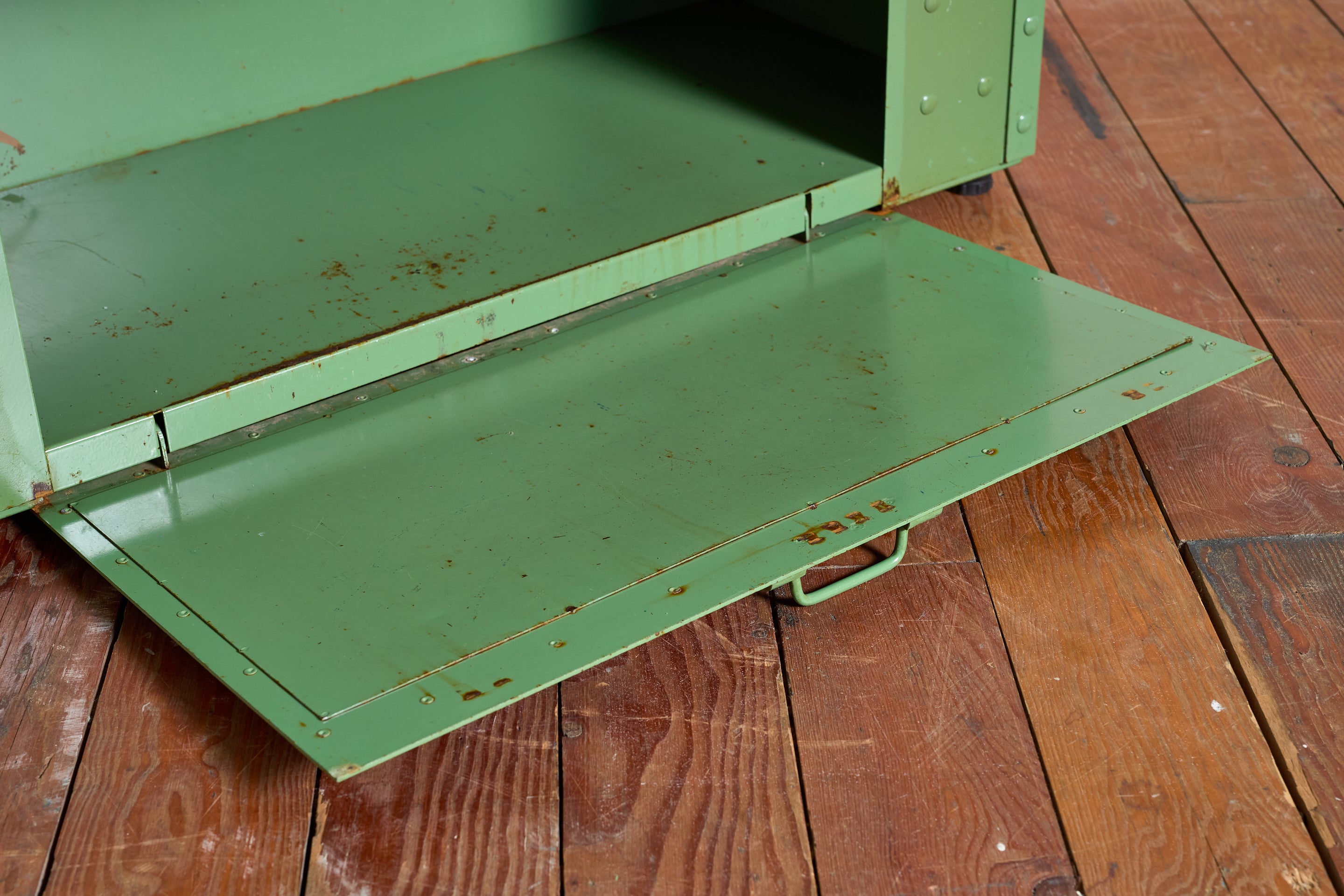 ABOUT Large sized cabinet in the style of Jean Prouve with industrial mint green steel base with fantastic patina and shape. Wonderfully constructed of cherry... View full product details