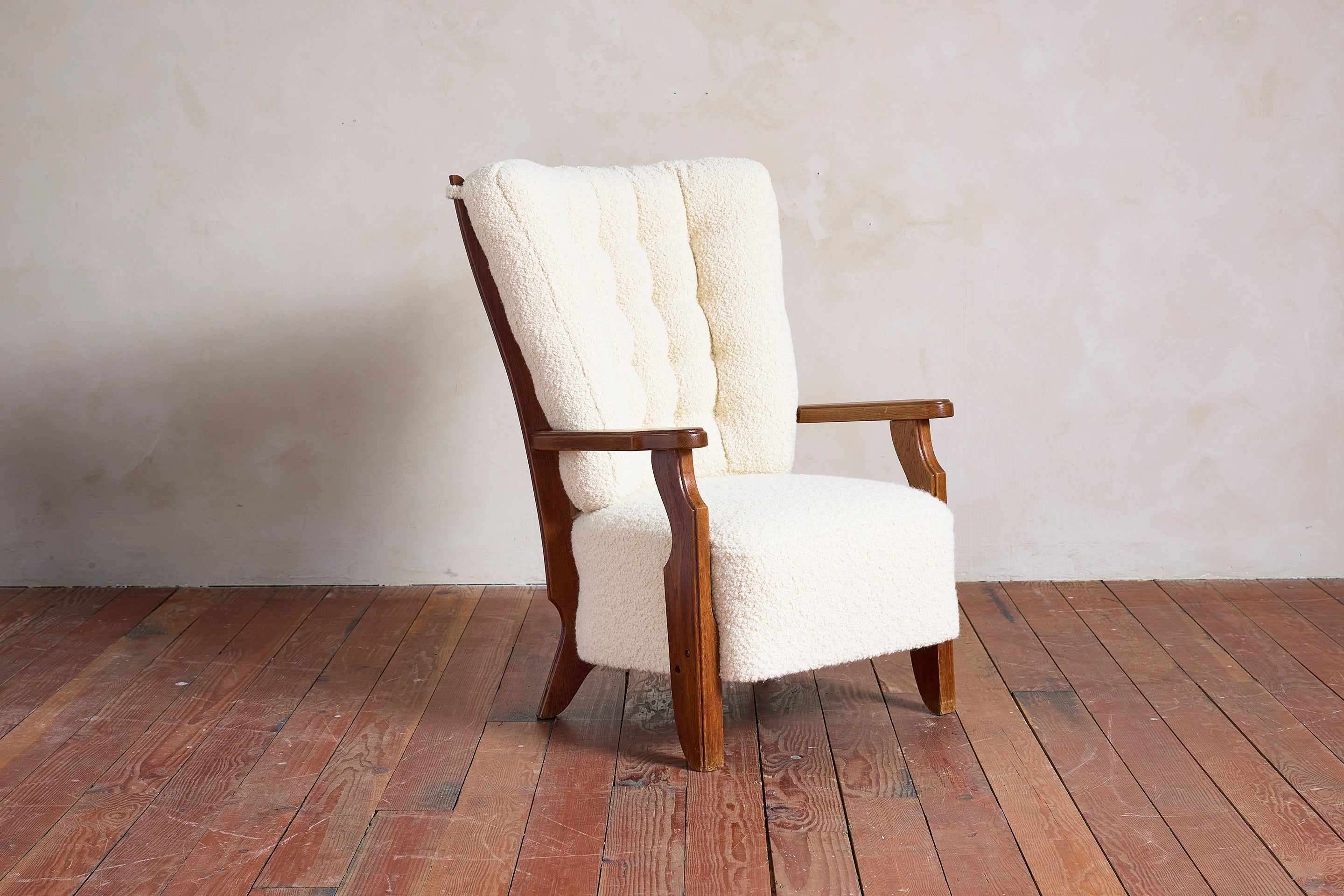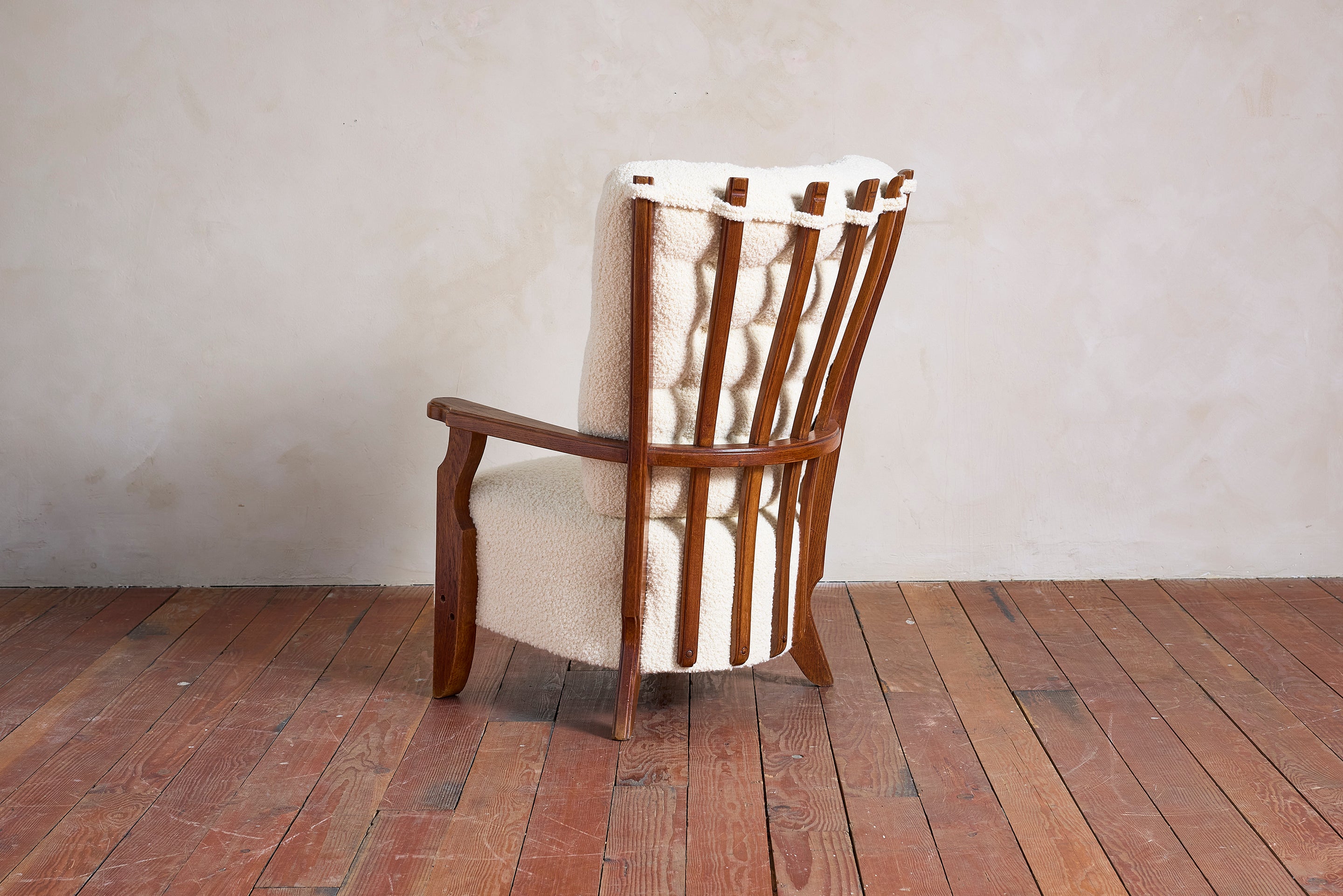 Guillereme et Chambron Lounge Chair—France 1950's Beautiful warm oak frame and upholstered in thick creamy white alpaca wool that feels like shearling fur. : 41"H... View full product details
