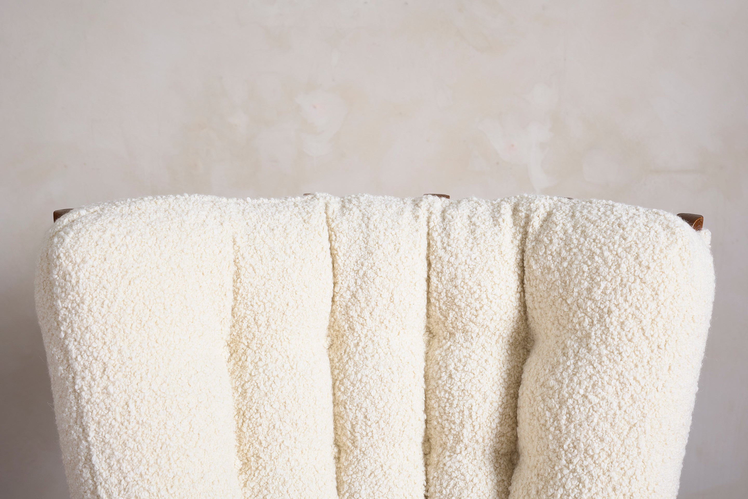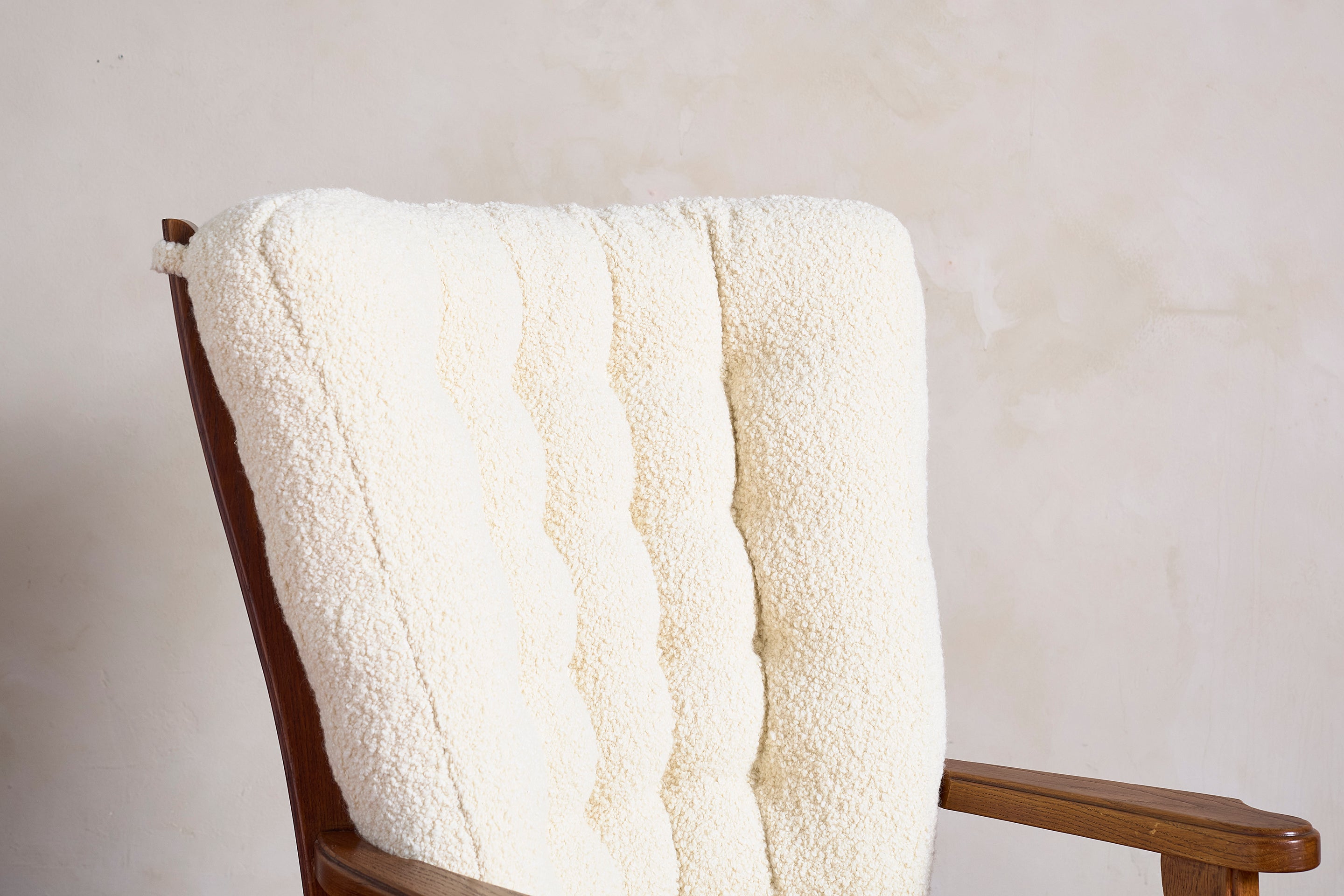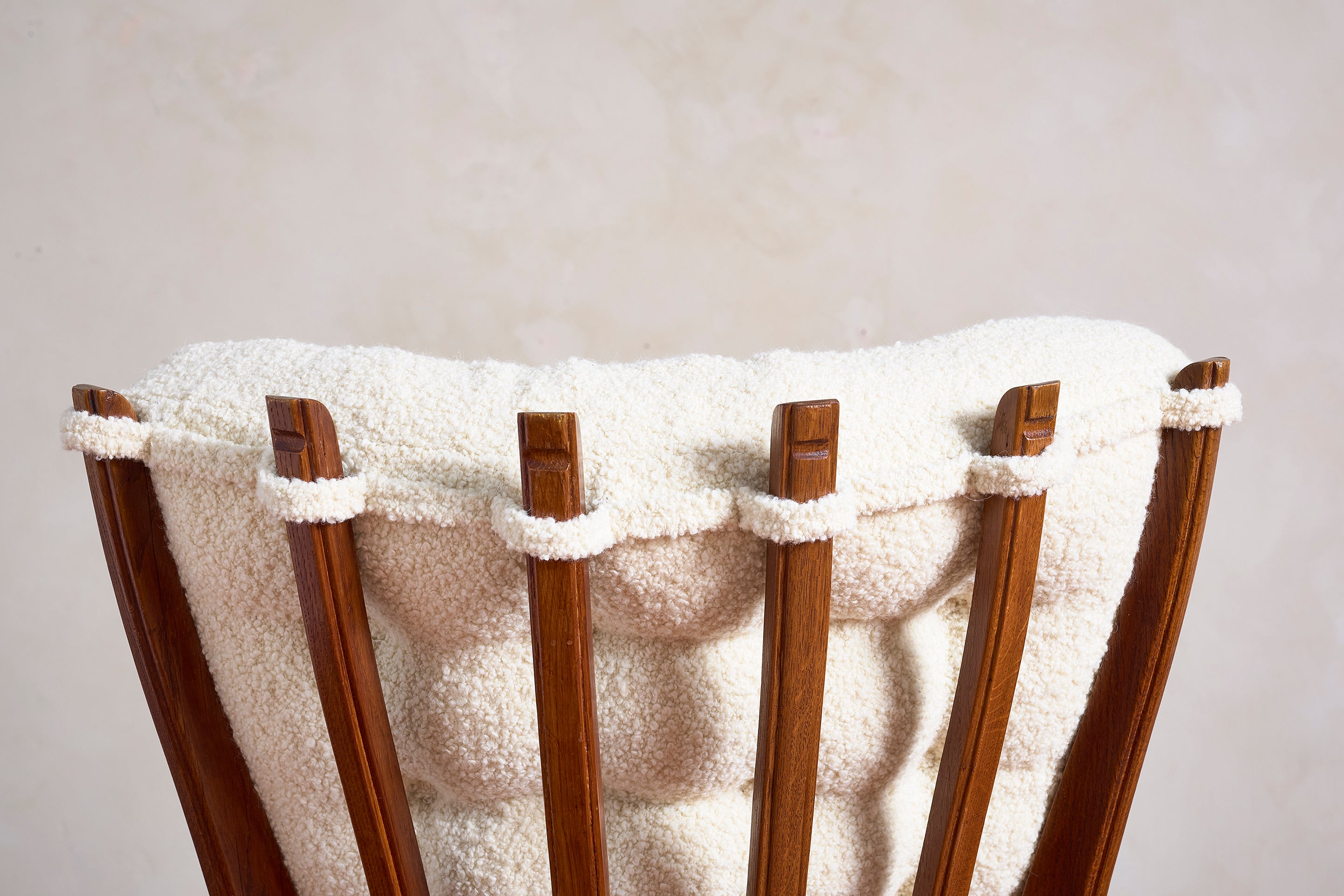 Unique 1950's Italian Sculptural Arm Chairs with bleached walnut frames and newly reupholstered in white boucle. Armchairs have a unique carved cutout detail in the... View full product details