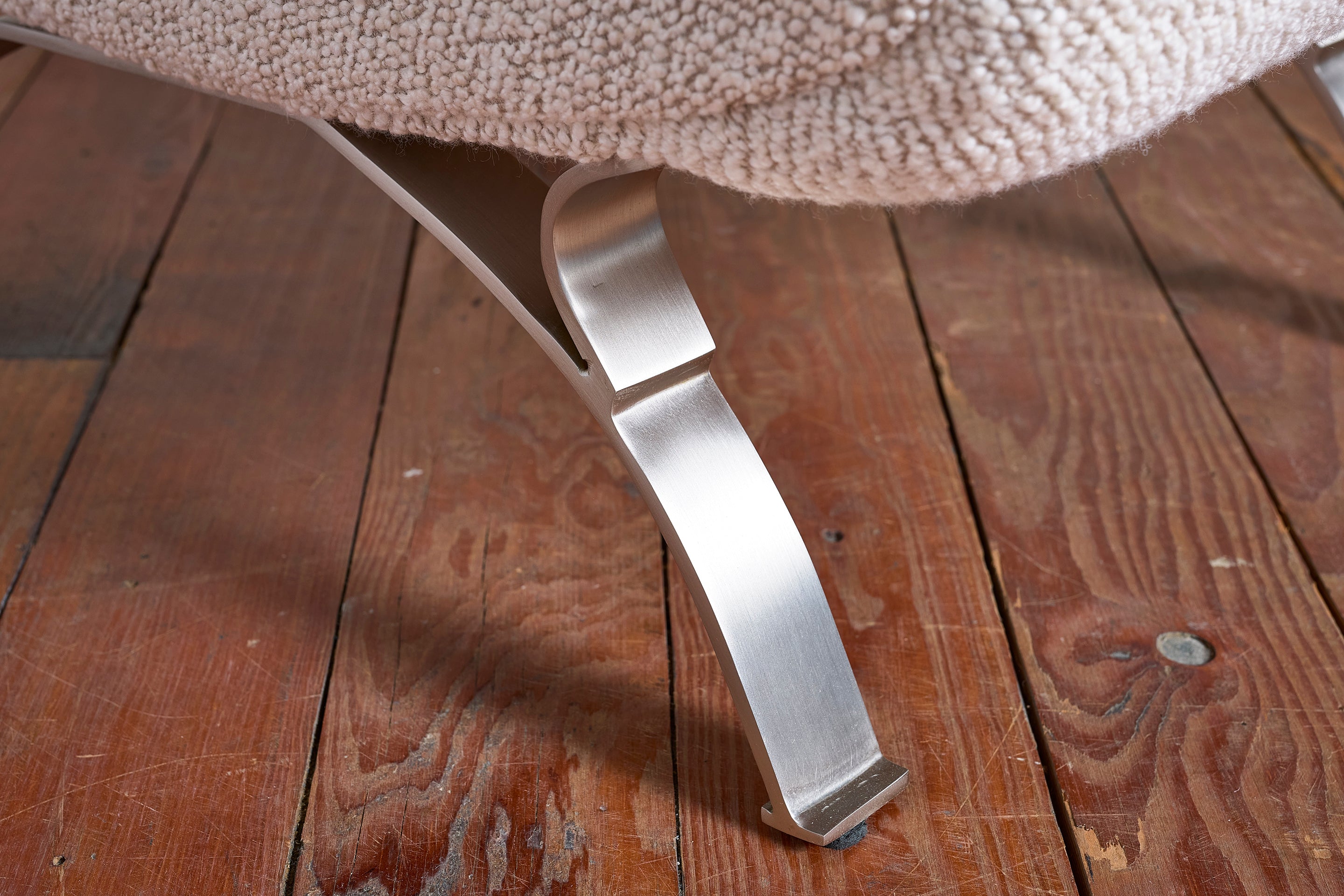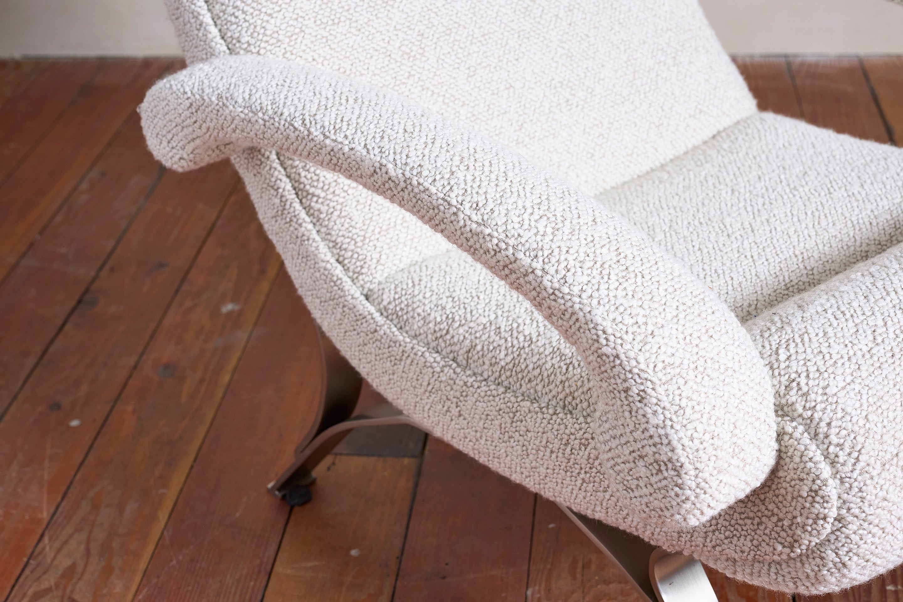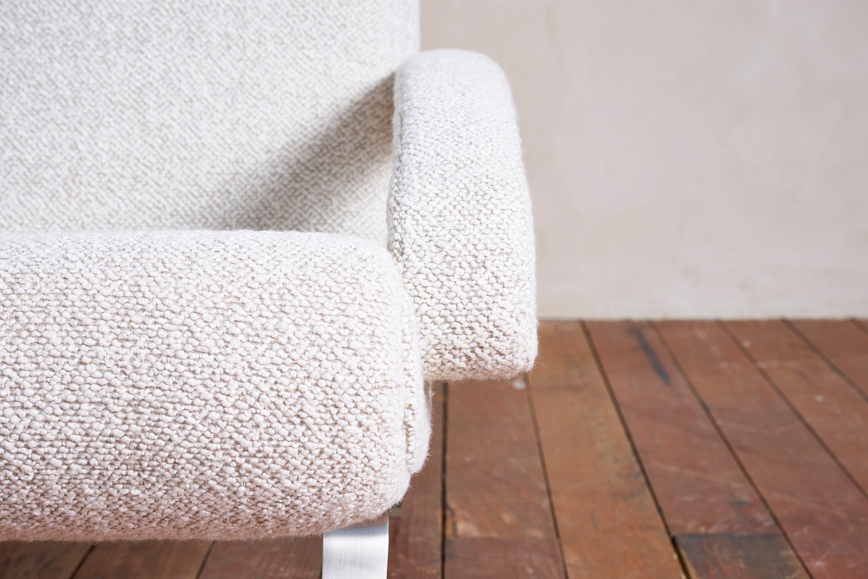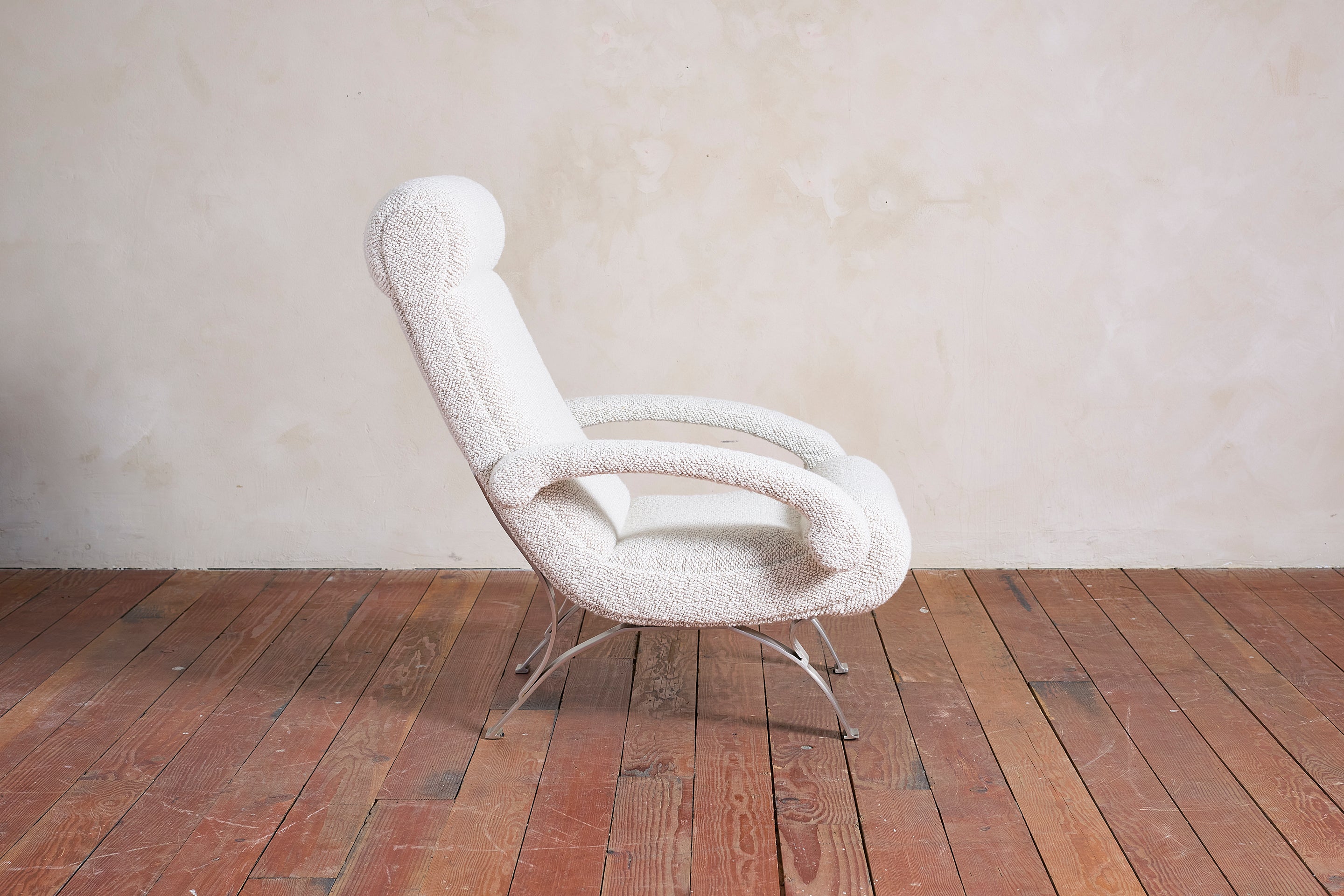 Beautiful pair of Italian armchairs Reupholstered in beautiful textured wool boucle fabric with arched stainless steel frames. Sculptural and undulated curved profile. Italy, 1970. :... View full product details
