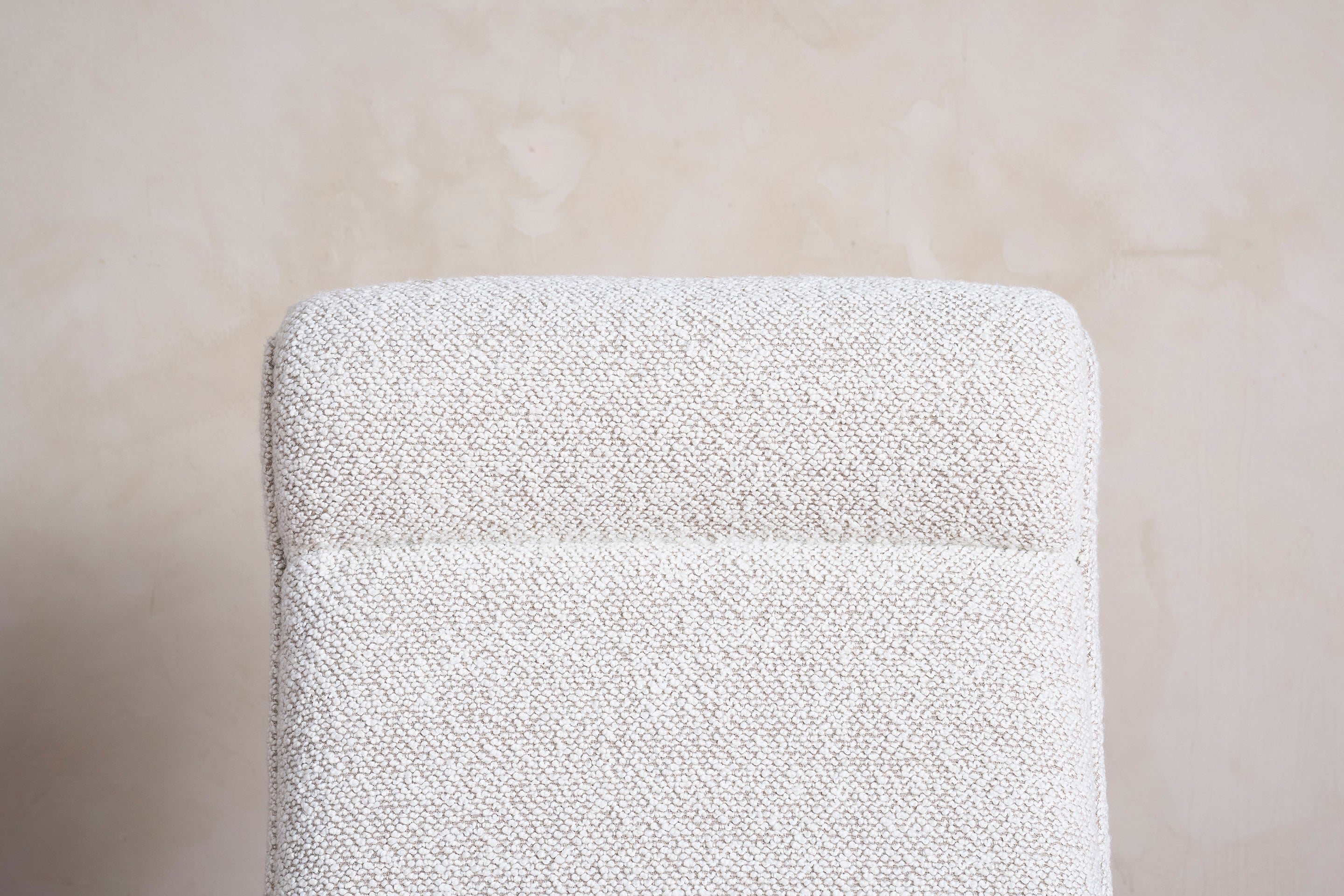 Rene Gabriel daybed with simple oak frame with wonderful patina and recessed legs. New cushion upholstered in natural Bouclé with taupe mohair bolster and leather... View full product details