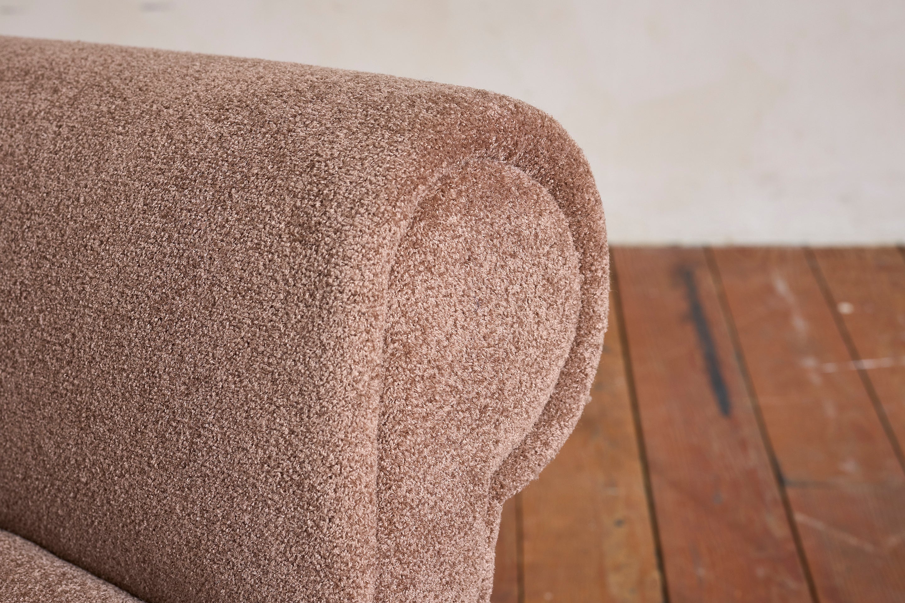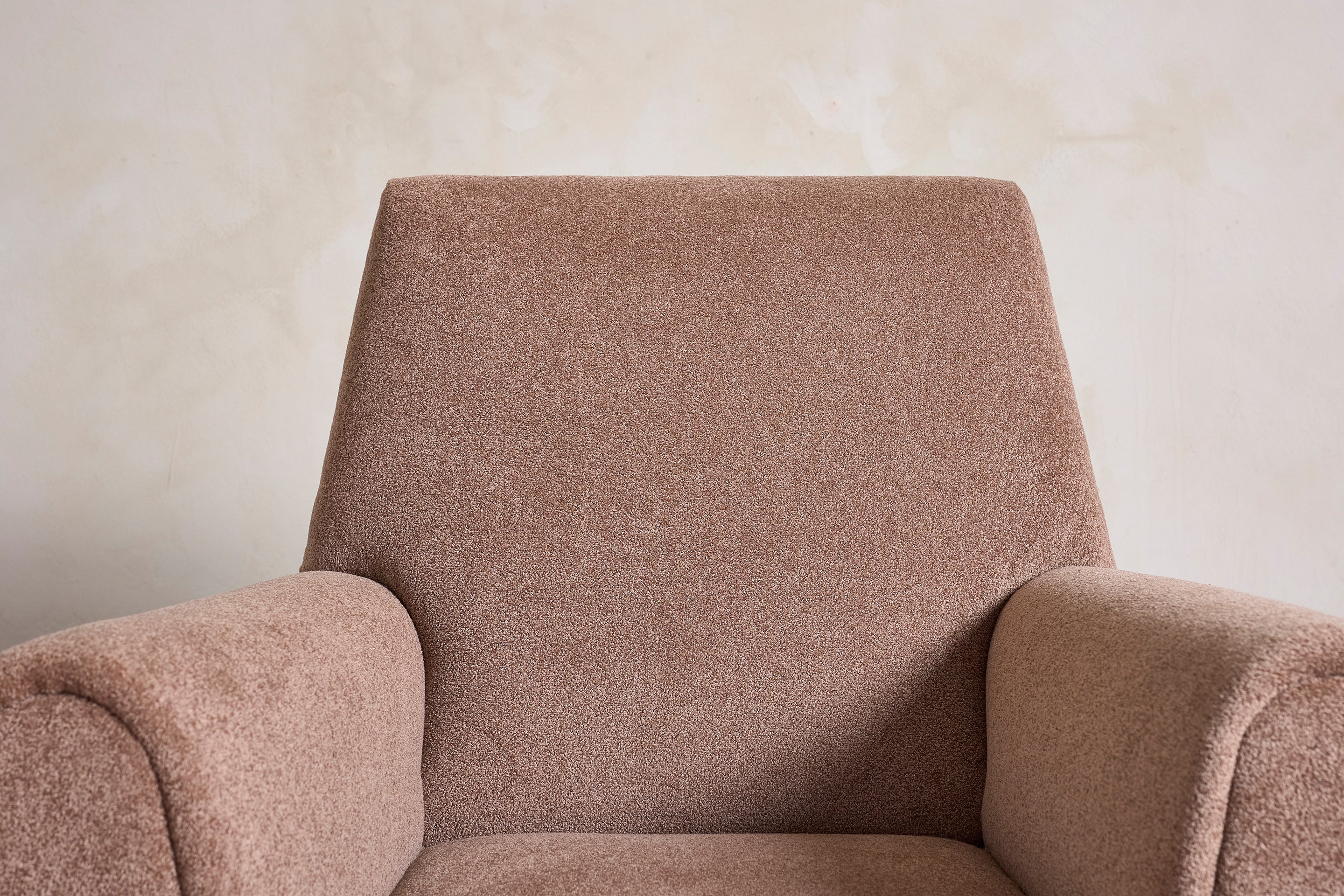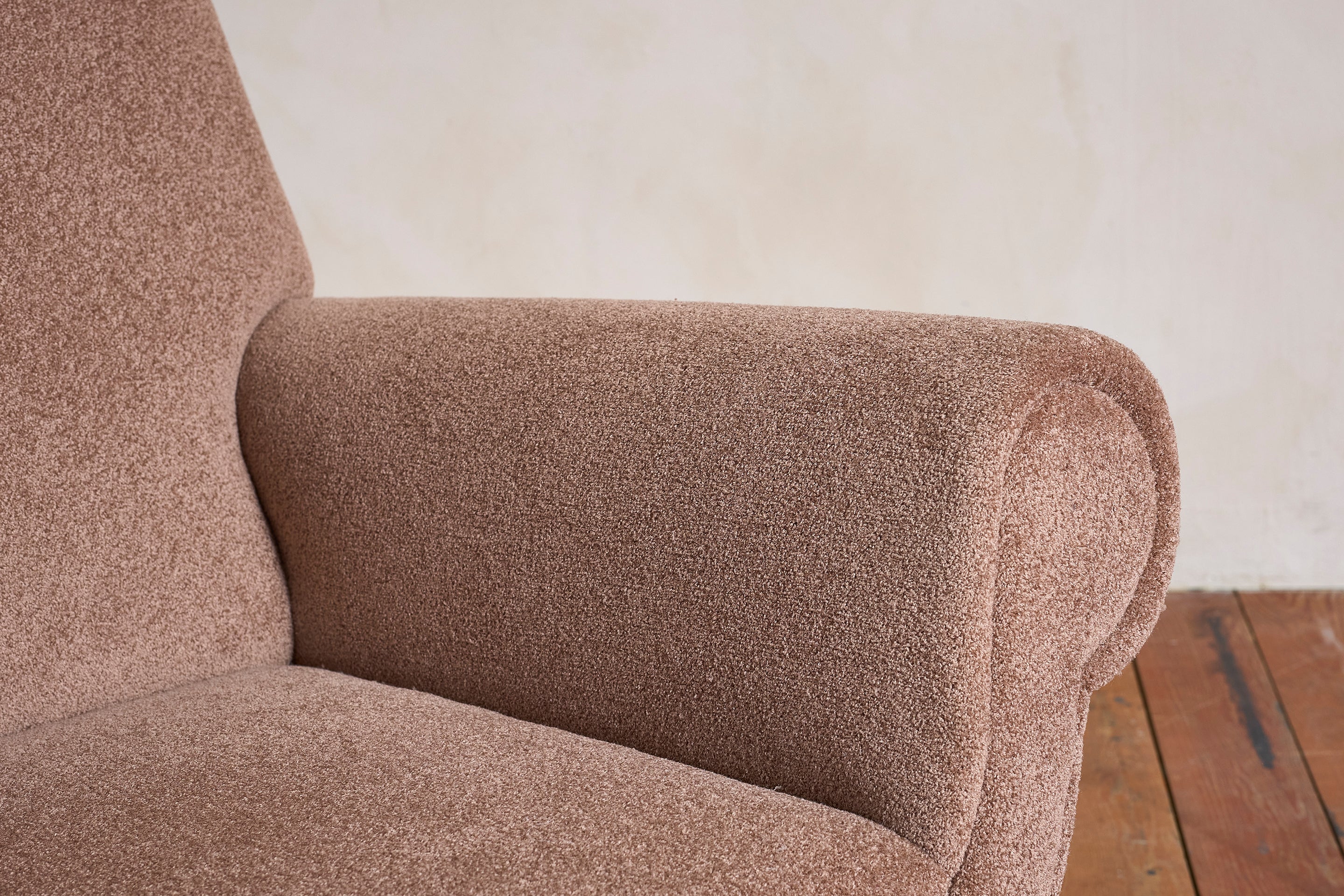 Large pair of Gigi Radice armchairs with thick curved arms - Italy, 1960s Newly upholstered in gorgeous tan boucle Original black iron legs and brass... View full product details