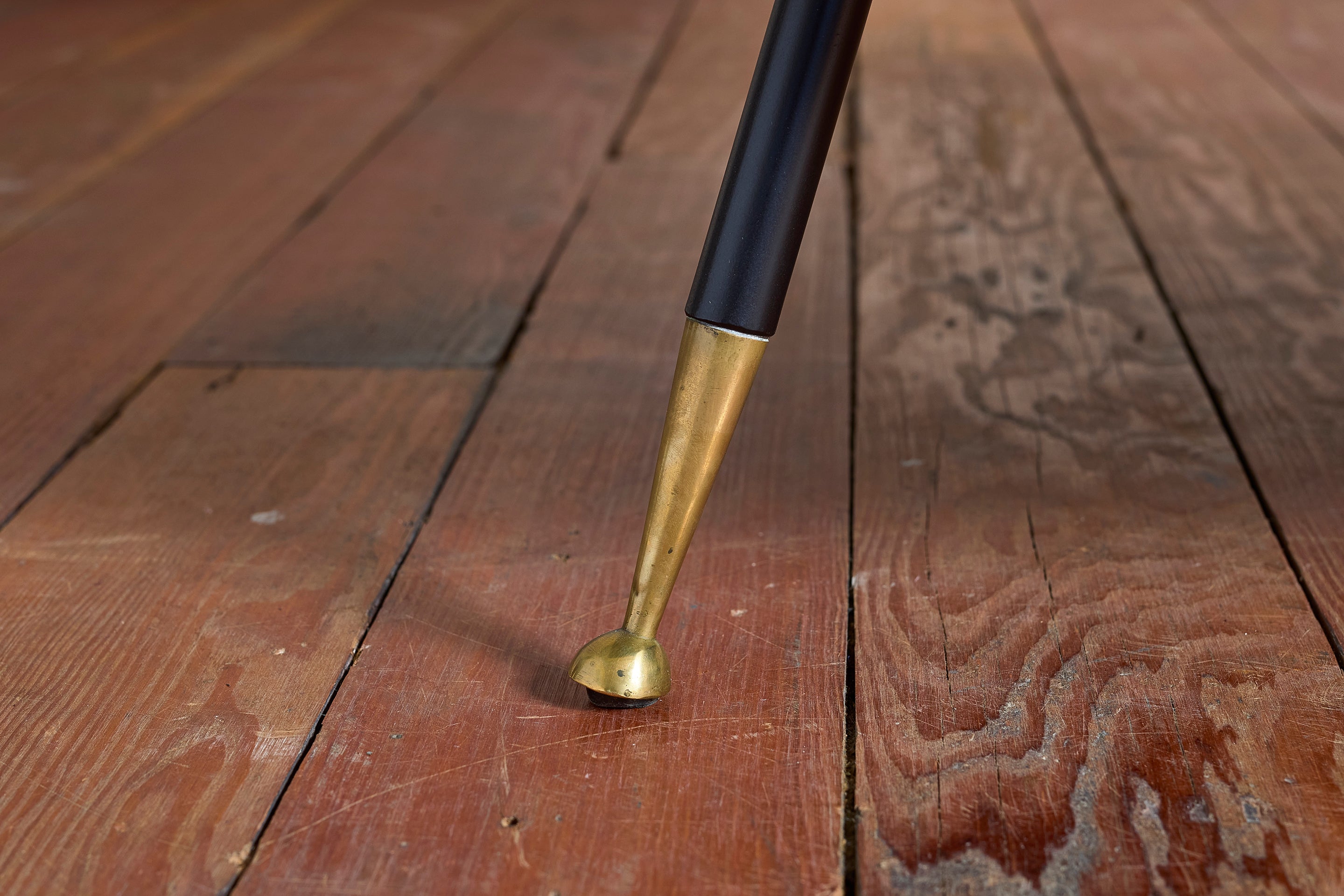 ABOUT Jacques Quinet arm chair in black leather with signature contrast hand stitching and thick brass feet. Wonderful angled legs and patina to leather on... View full product details
