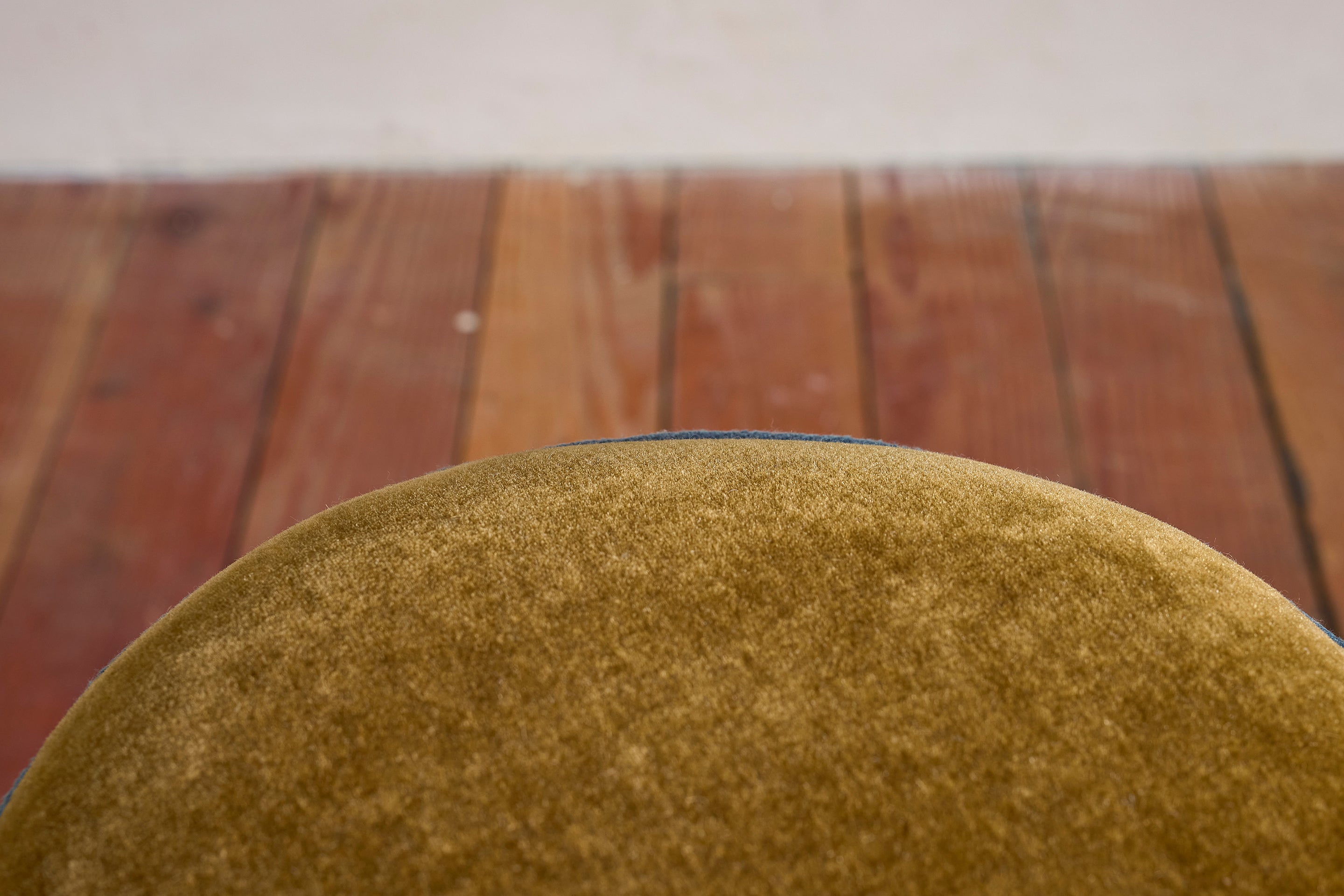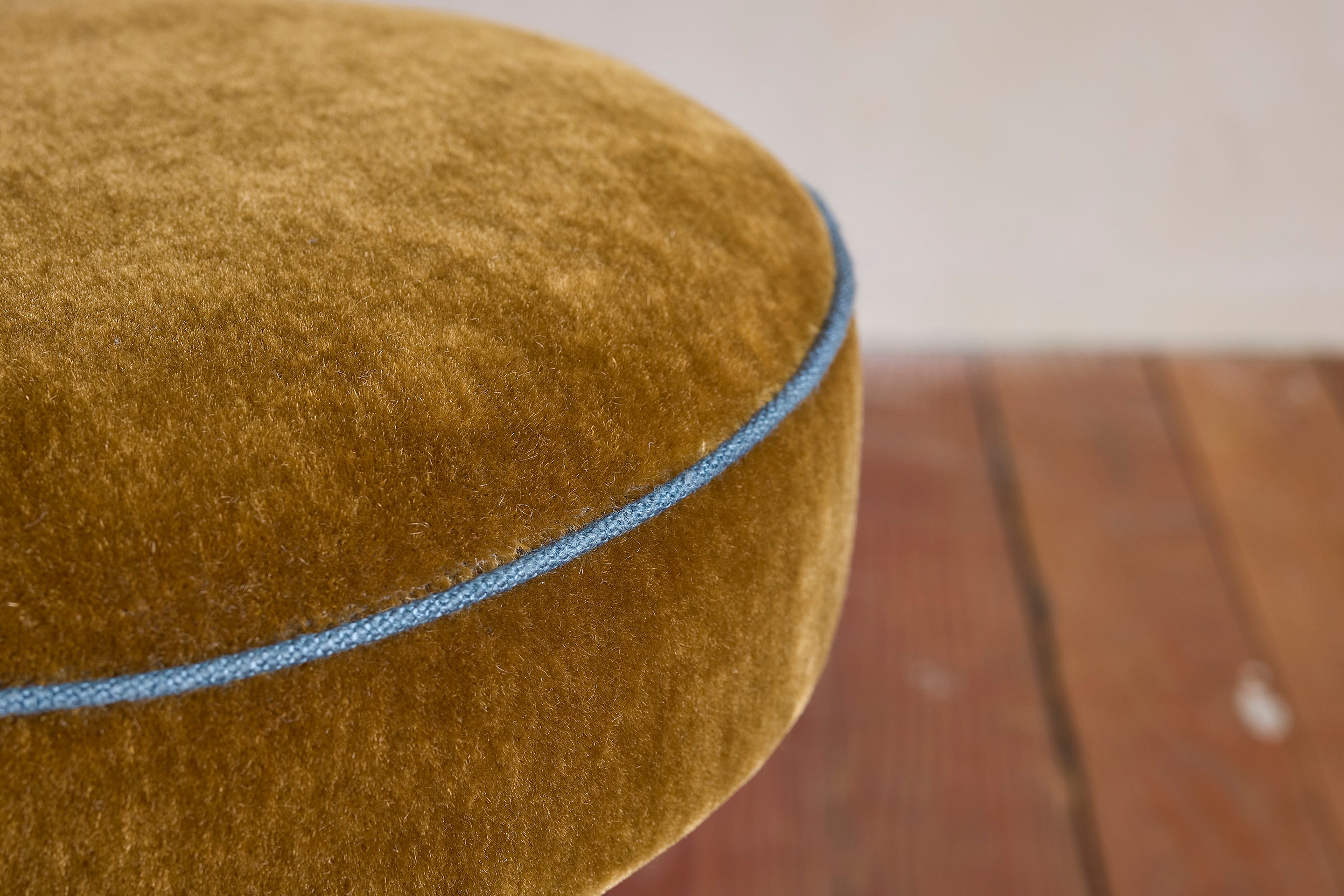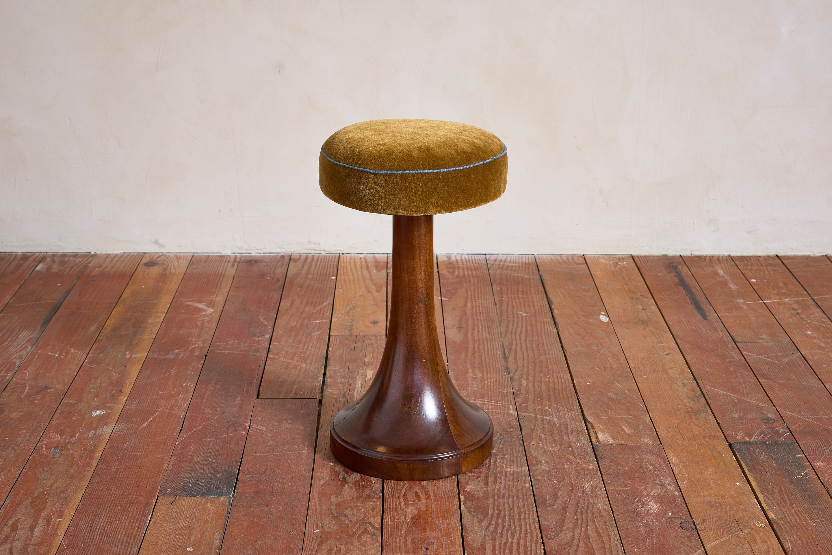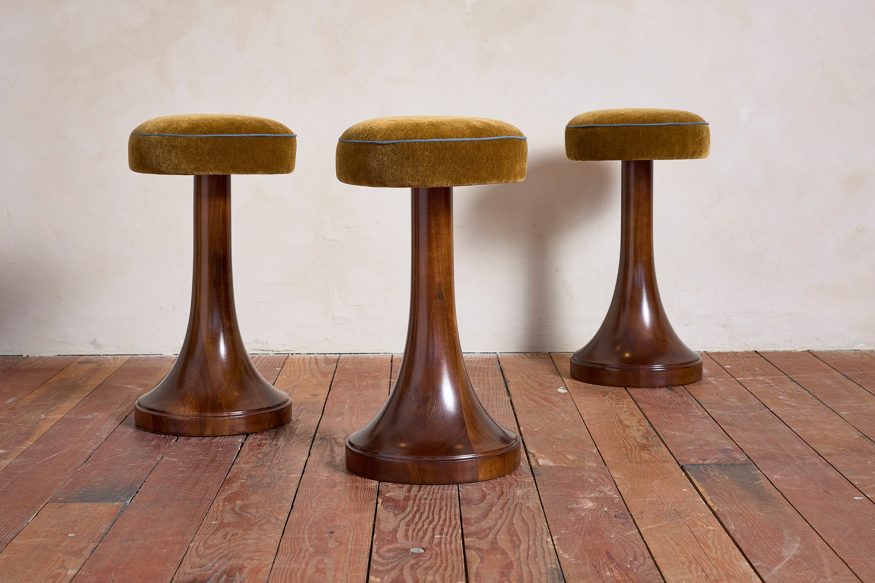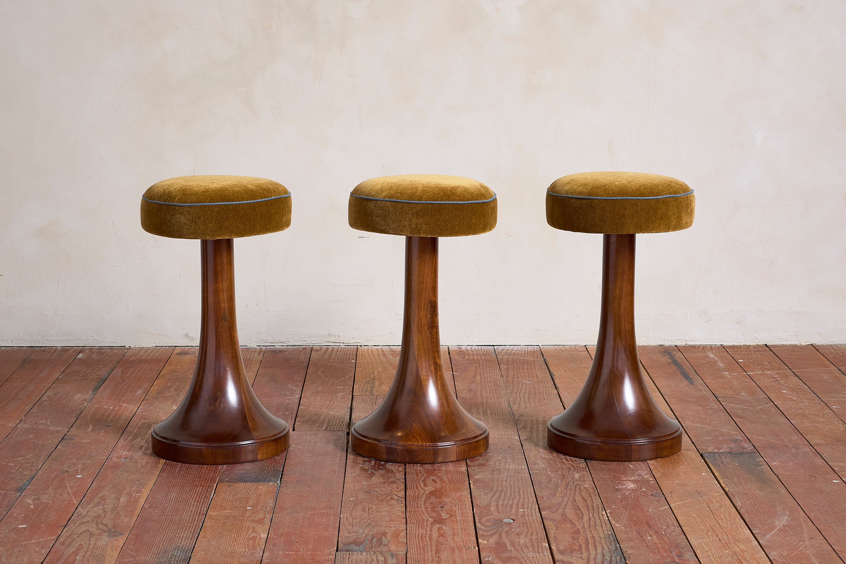1960's Italian stools - Set of 3 Curved walnut tulip shaped base newly upholstered in a gorgeous mohair with contrast blue piping : 22.5"H x... View full product details