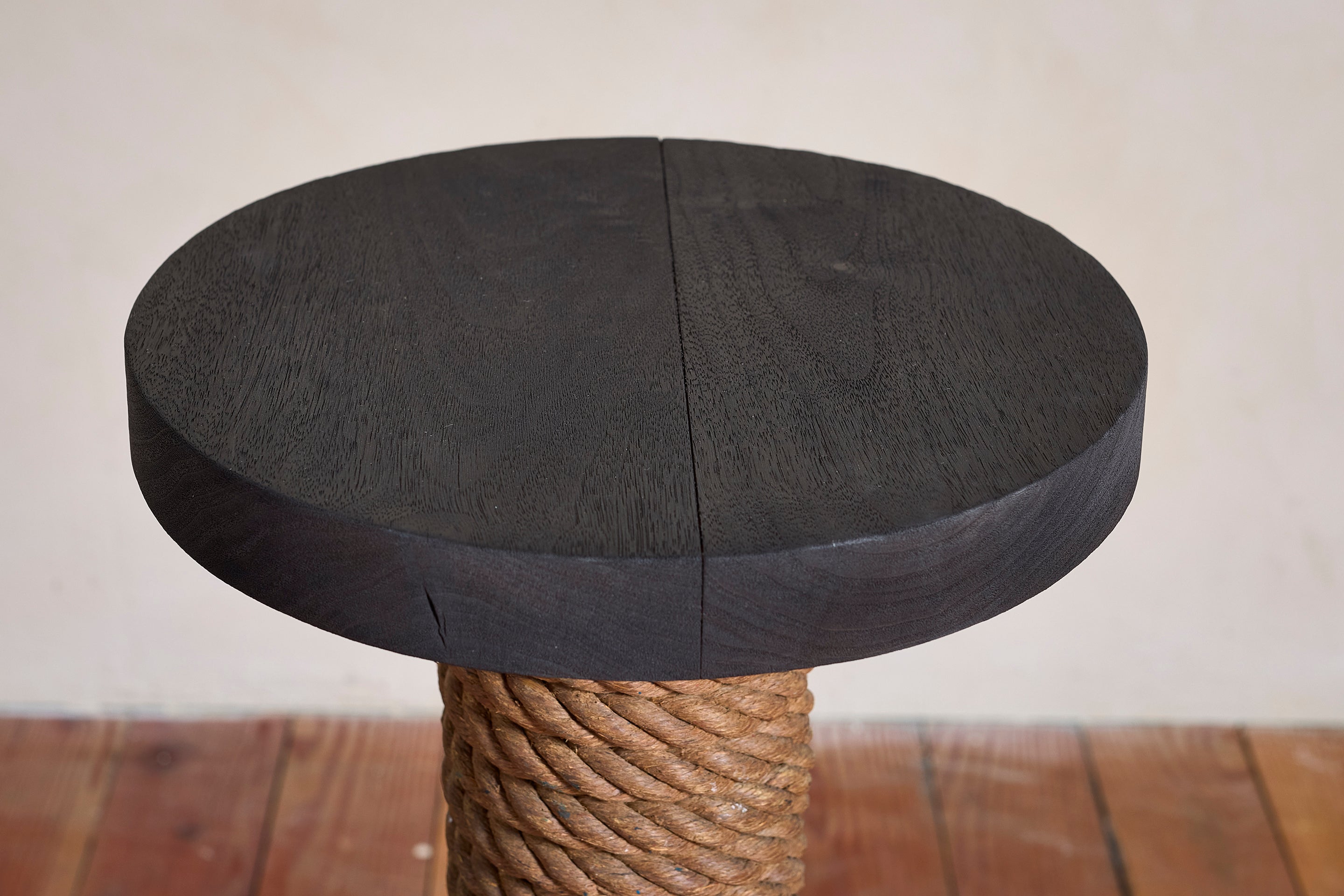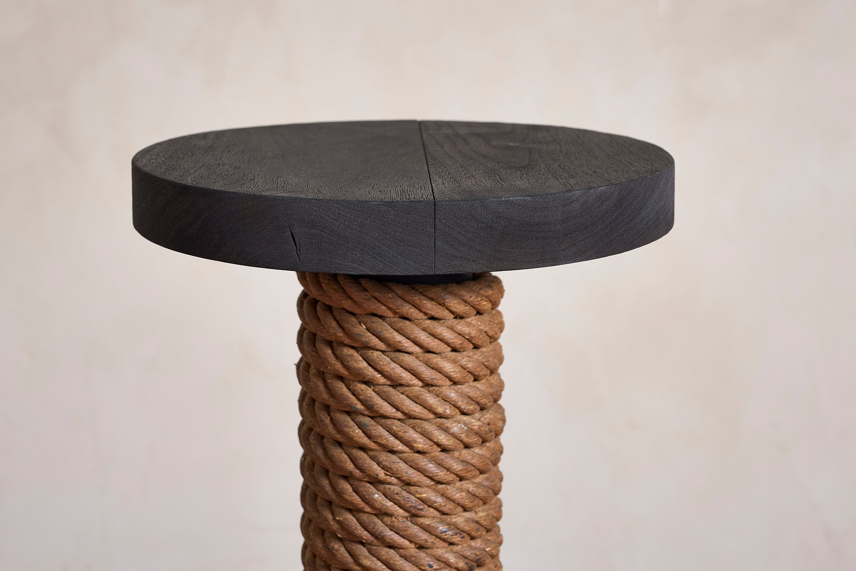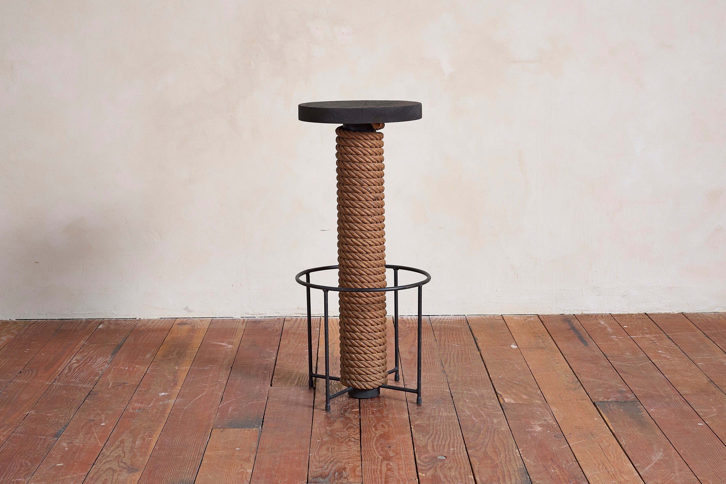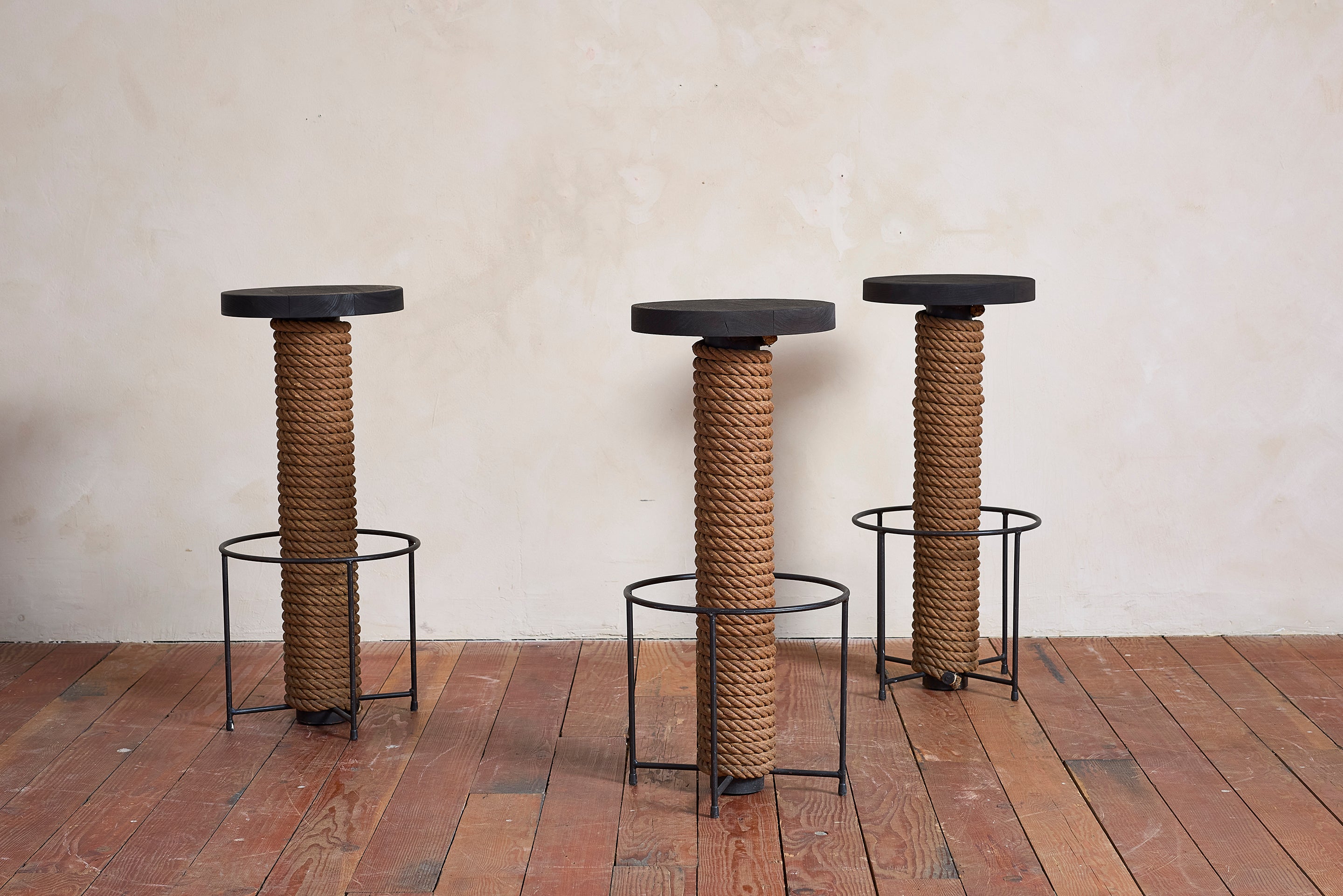 Set of three Audoux Minet rope barstools, France 1950's New walnut top with Shou Sugi Ban finish - done in traditional japanese style. Signature woven... View full product details