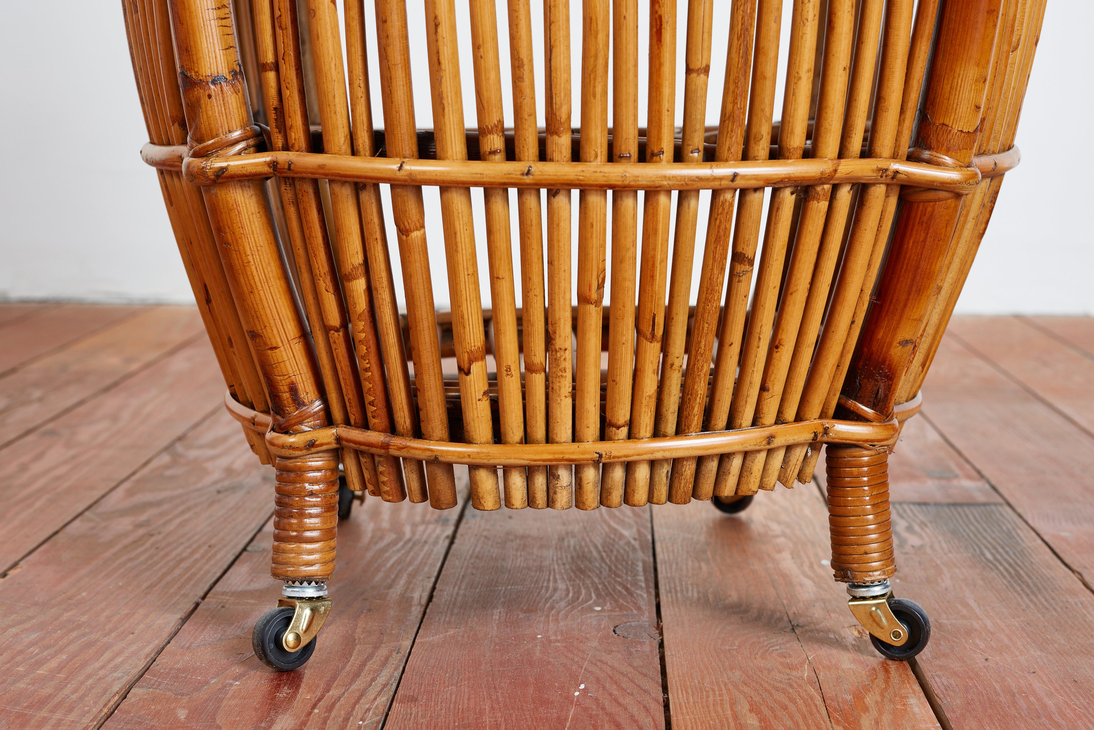 Unique Italian bamboo bar cart by Tito Agnoli Great shape with brass caster and 2 shelves Italy, 1950s