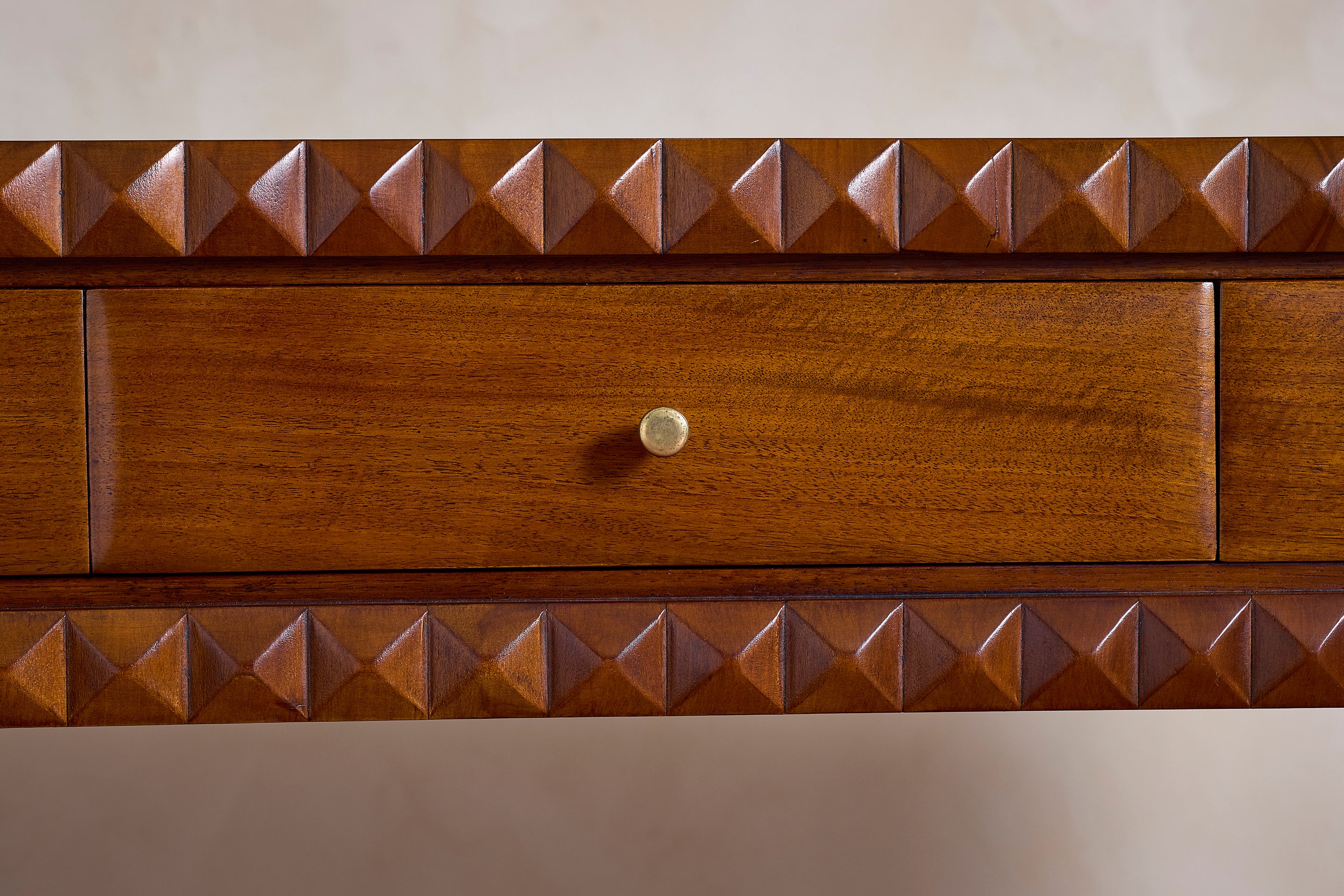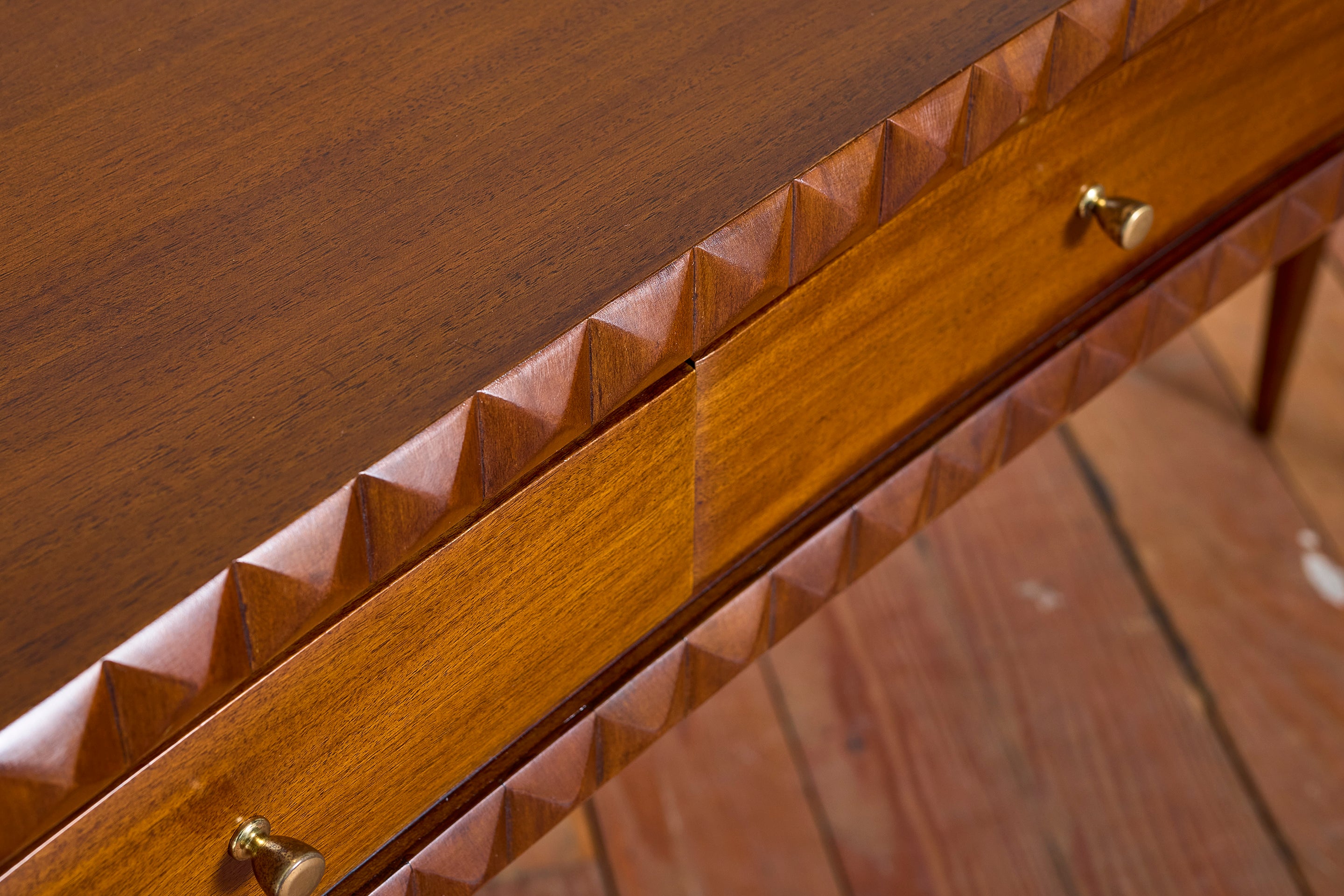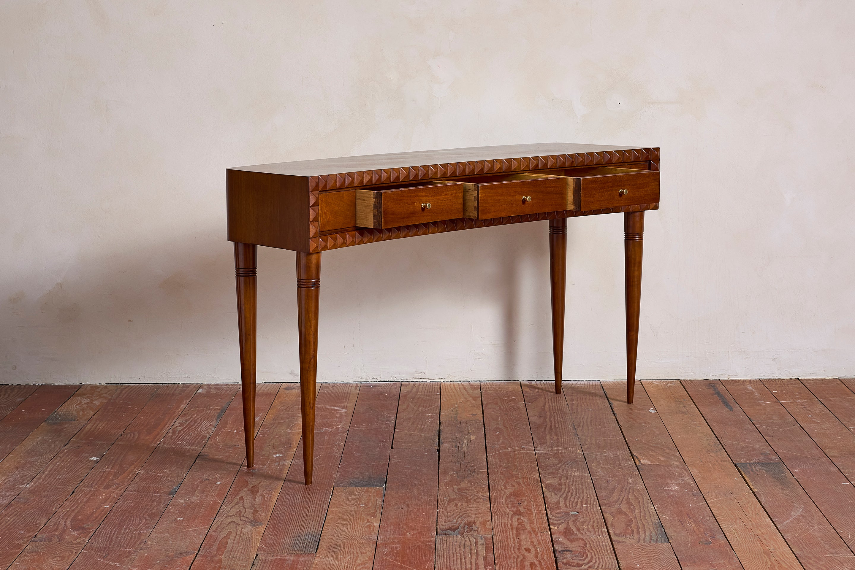 Gorgeous Paolo Buffa Console—Italy, 1950s Petite in scale with three-drawers and slightly curved body. Constructed of solid walnut and veneer with beautiful diamond 3 dimensional... View full product details