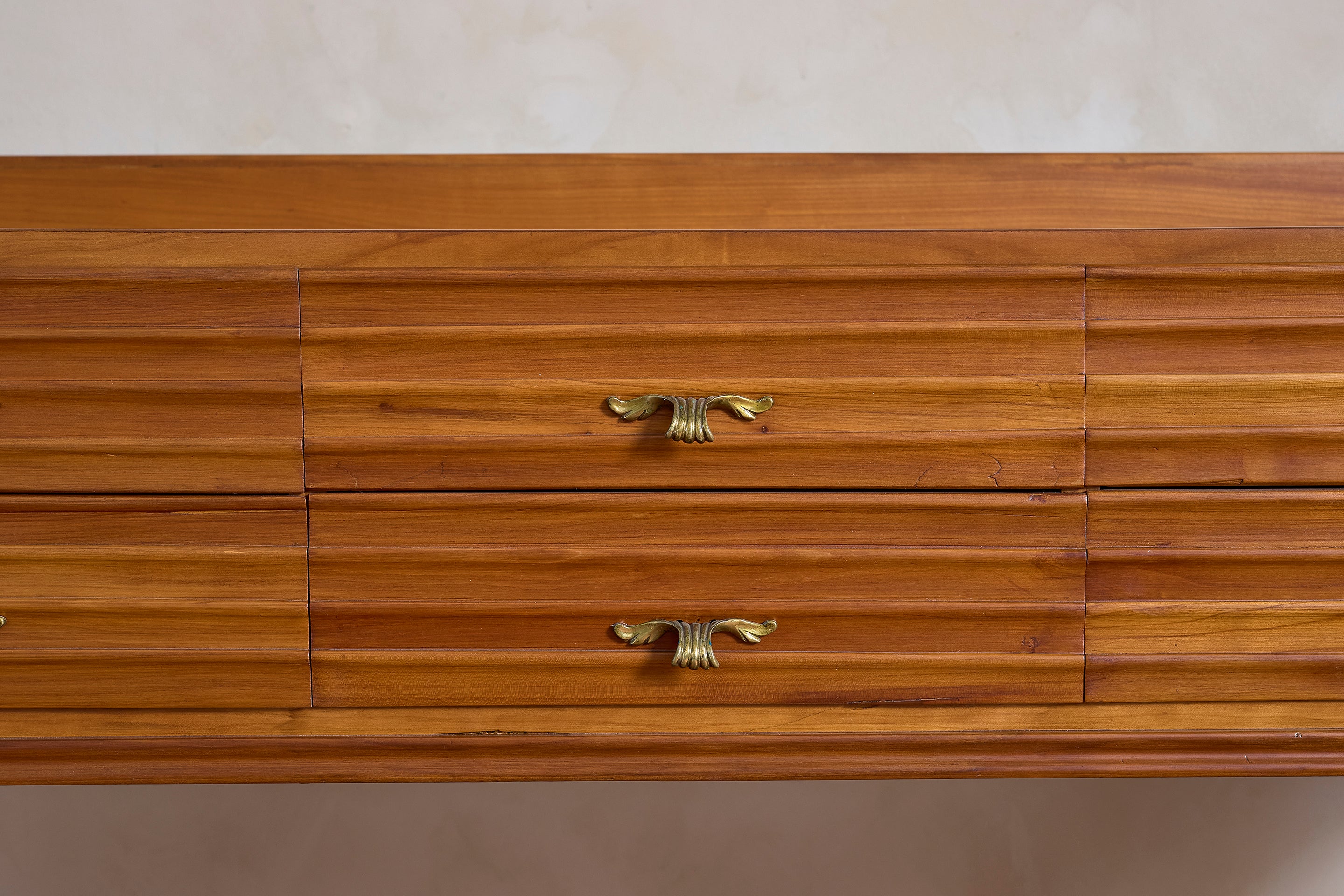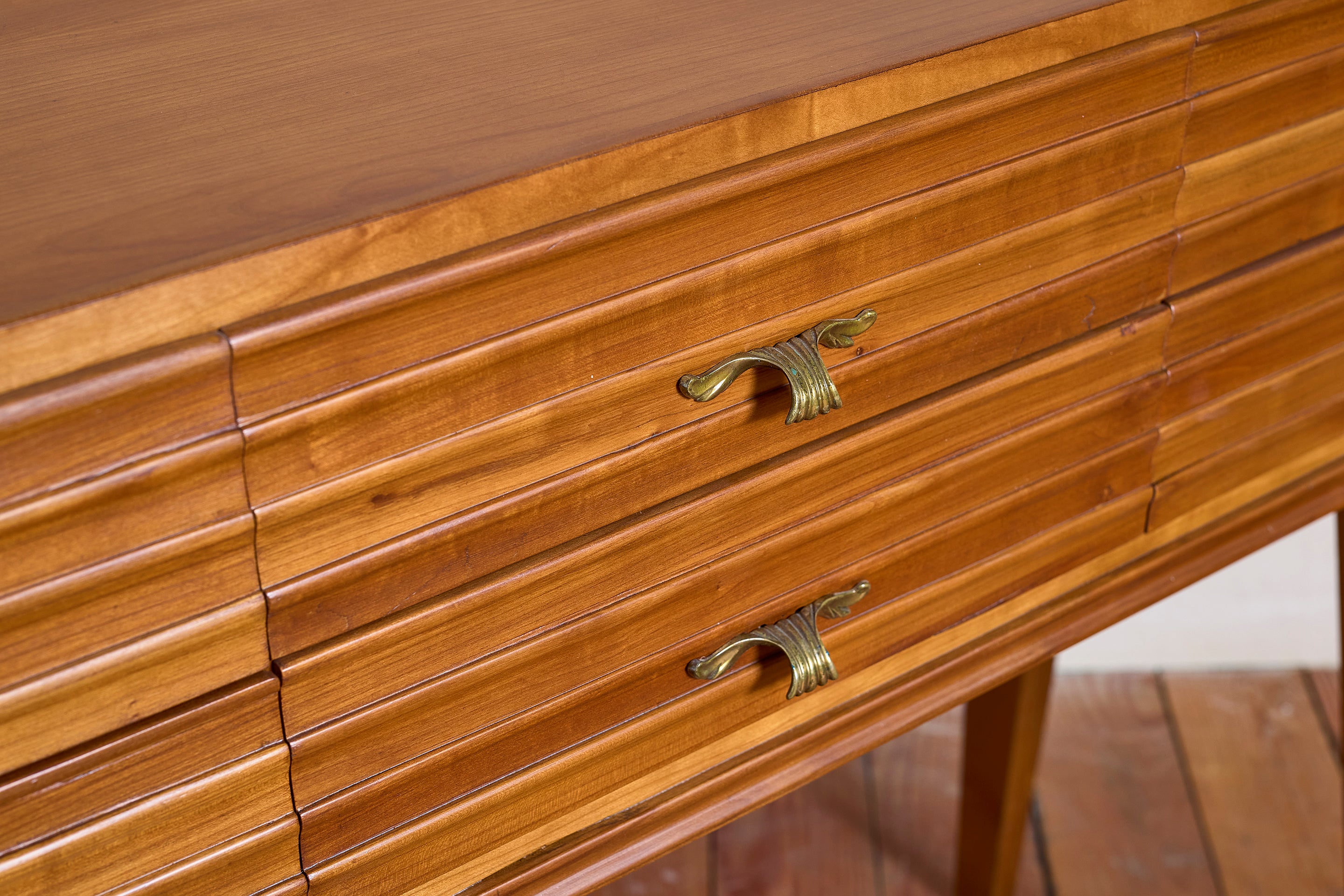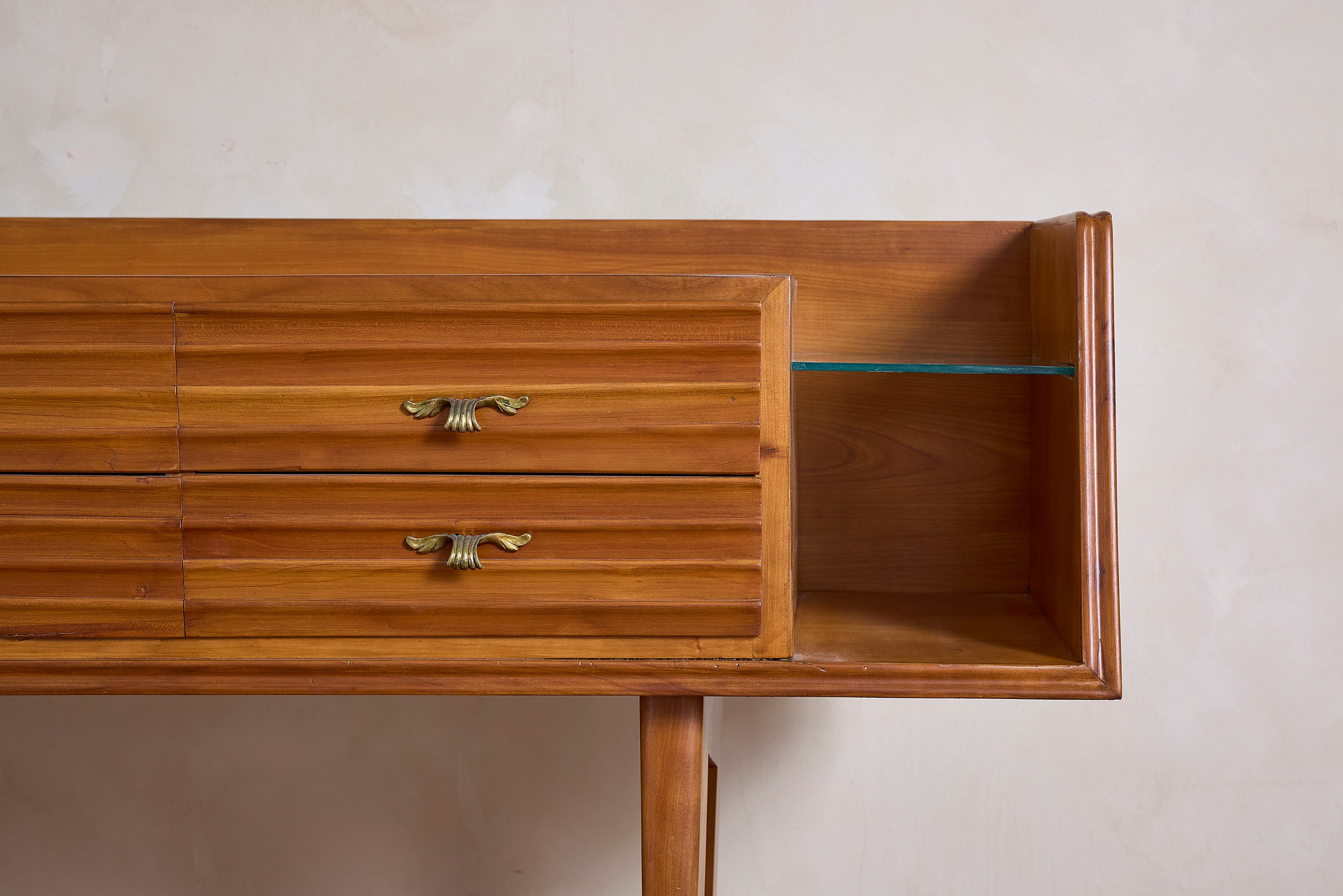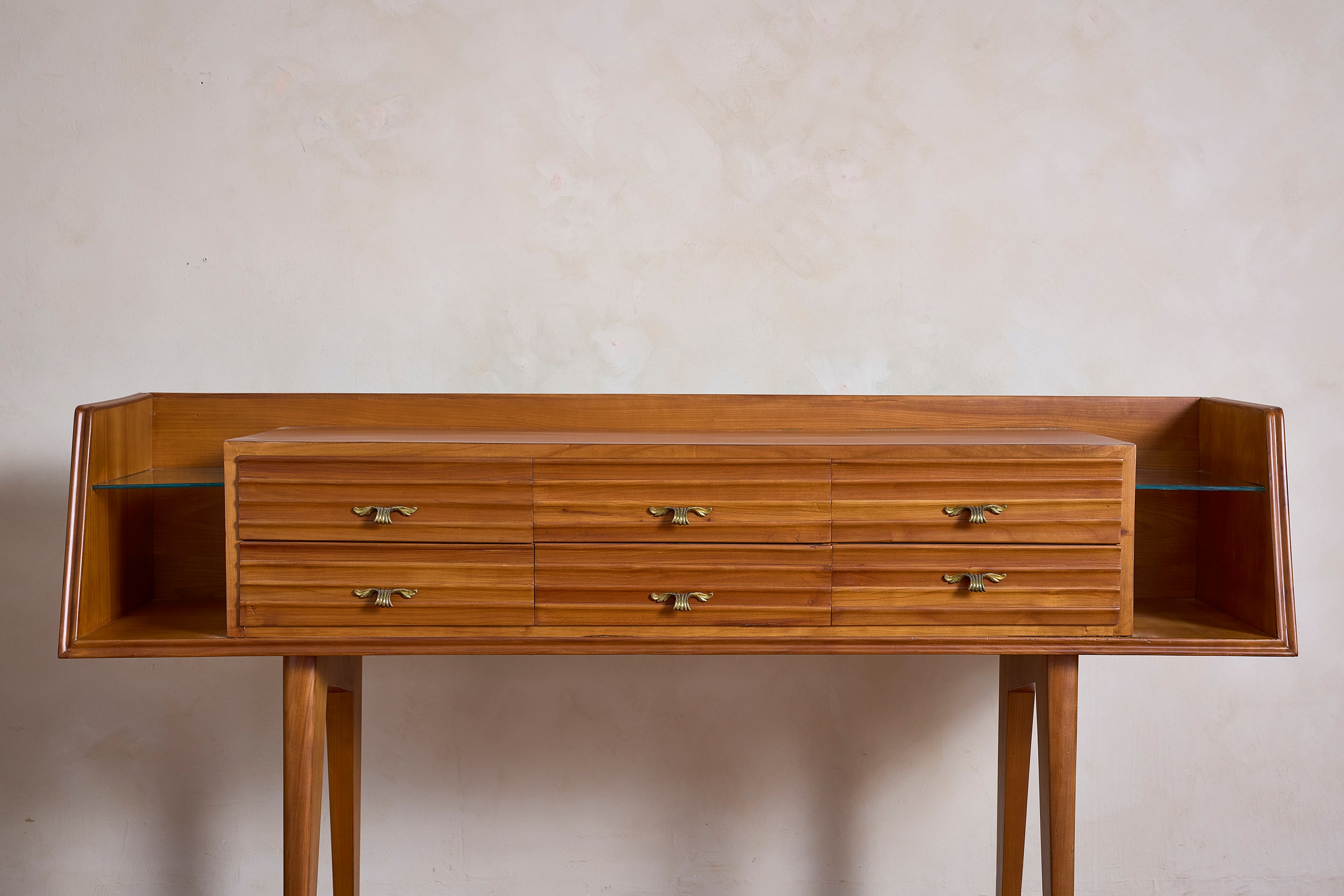 Wonderful console by Pierluigi Giordani—Italy 1950's Beautiful cherry wood with six combed center wood drawers with floating glass shelf on each side Brass decorative hardware... View full product details