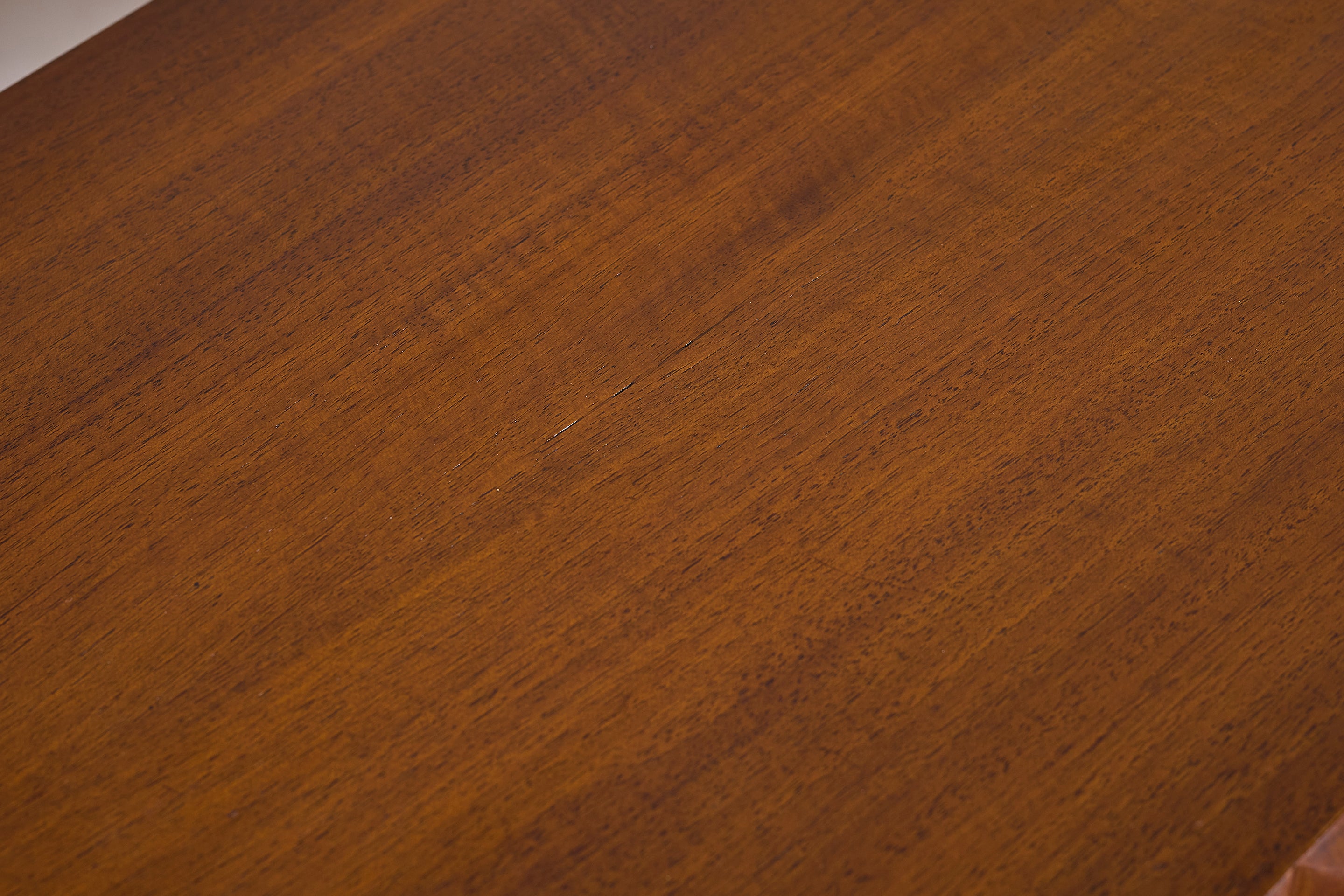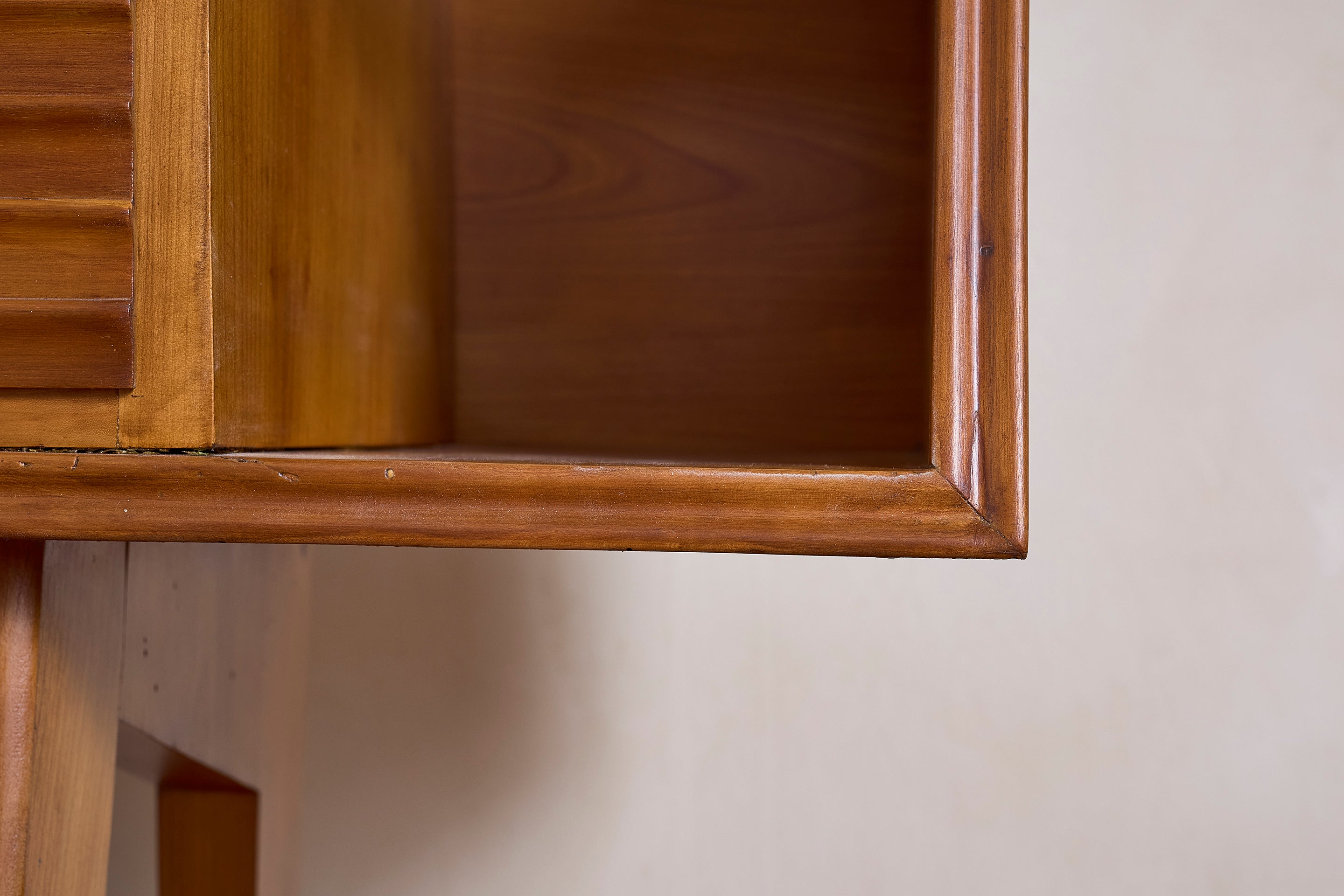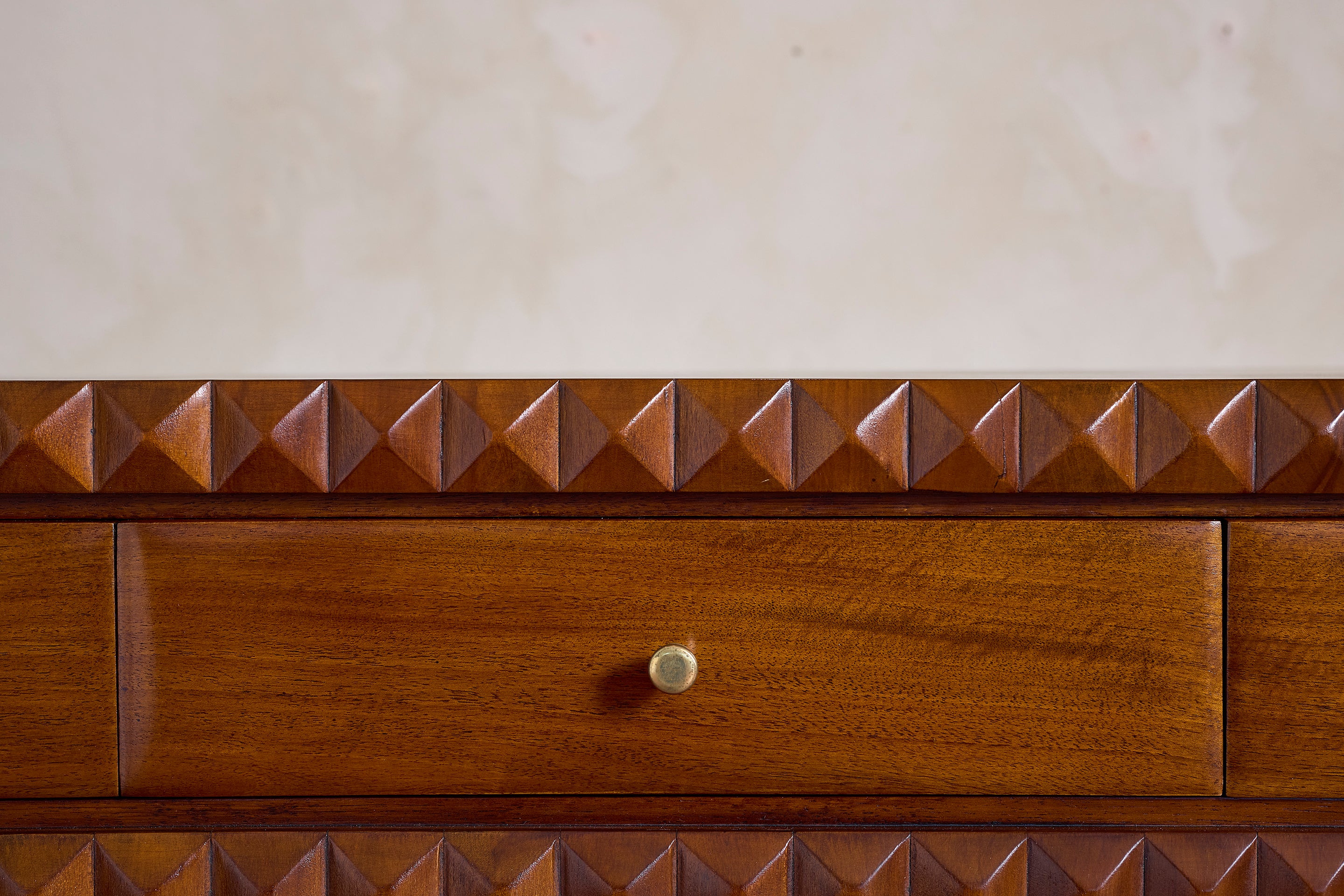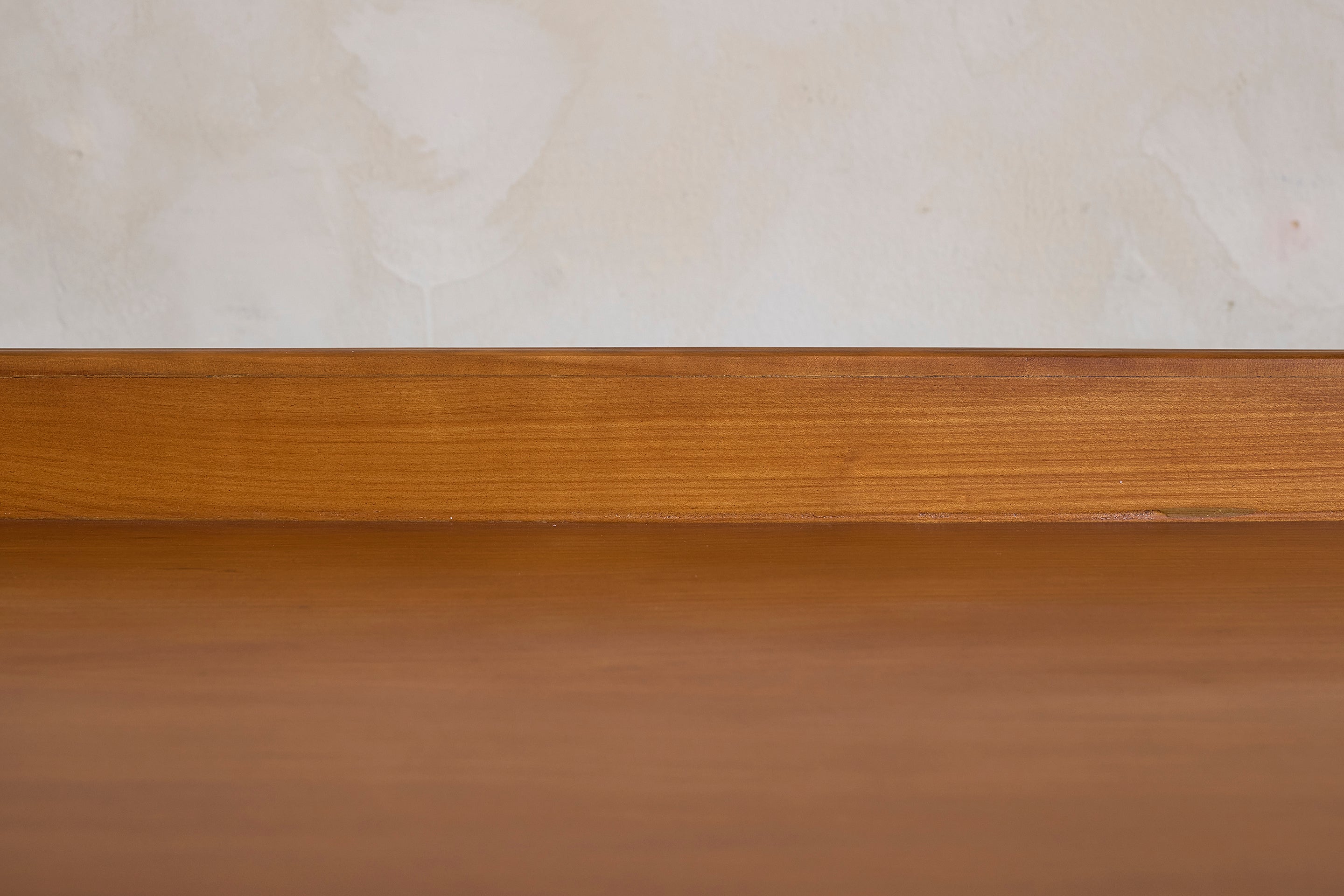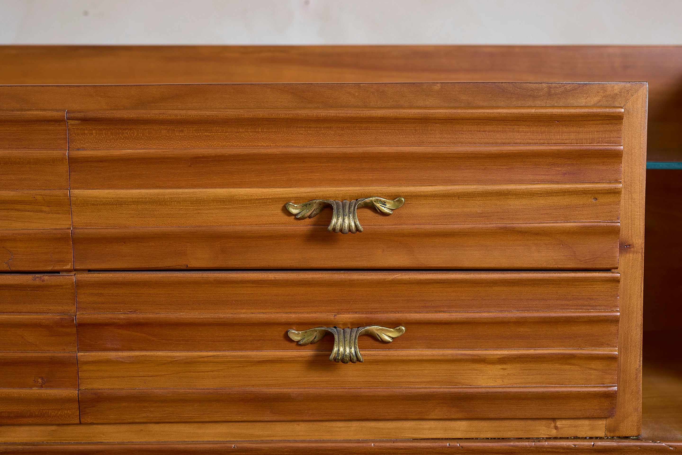 Wonderful console by Pierluigi Giordani—Italy 1950's Beautiful cherry wood with six combed center wood drawers with floating glass shelf on each side Brass decorative hardware... View full product details